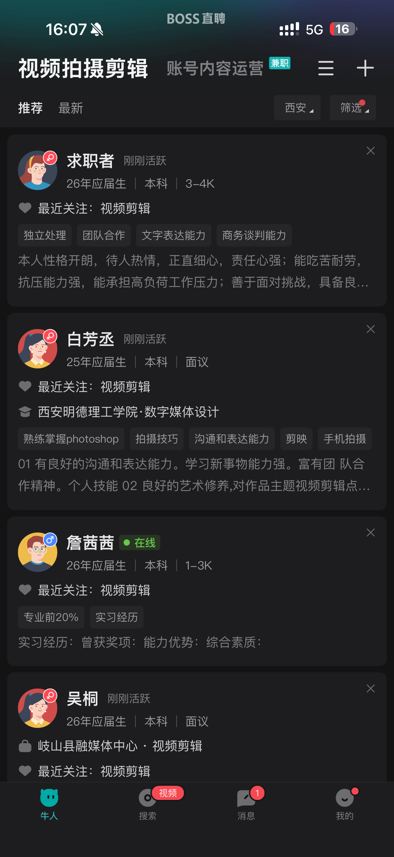 BOSS直聘现在真的挺一般的收费贵就罢了推荐的求职者一点也不精准网络初试这块,能正常聊天就已经领先一半的人多数的求职者都是“我是一块玉,等你来挖掘”的心态殊不知,千里马常有,但你也得跑起来让伯乐看到呀(゚Д゚;)💨印象最深的一份简历就是:全文加起来不到100字,就是把教育经历说了一遍,且生日写成了电话虽说以能力论英雄,但也不能太敷衍吧