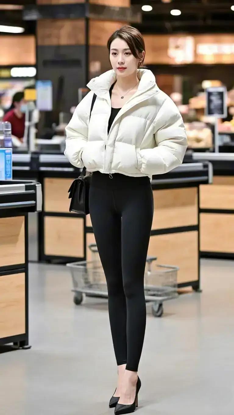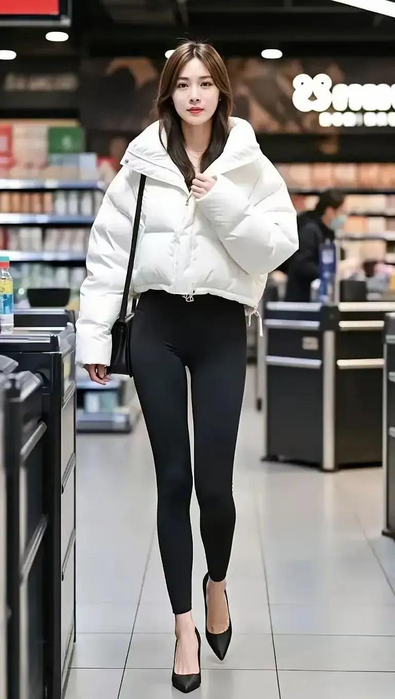 白色的短款羽绒服,保暖有时尚清新,黑色的修身裤搭配黑色的高跟鞋,拉长了腿部线条,令整体形象看着高挑有气质!