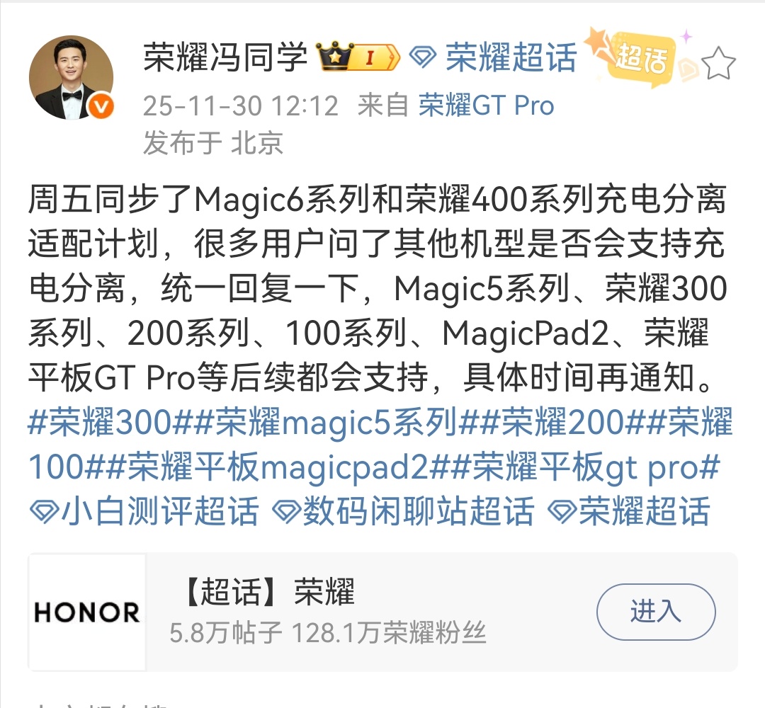荣耀现在给我的感觉是低调干实事。比如这个充电分离功能,几年前的手机都在适配。