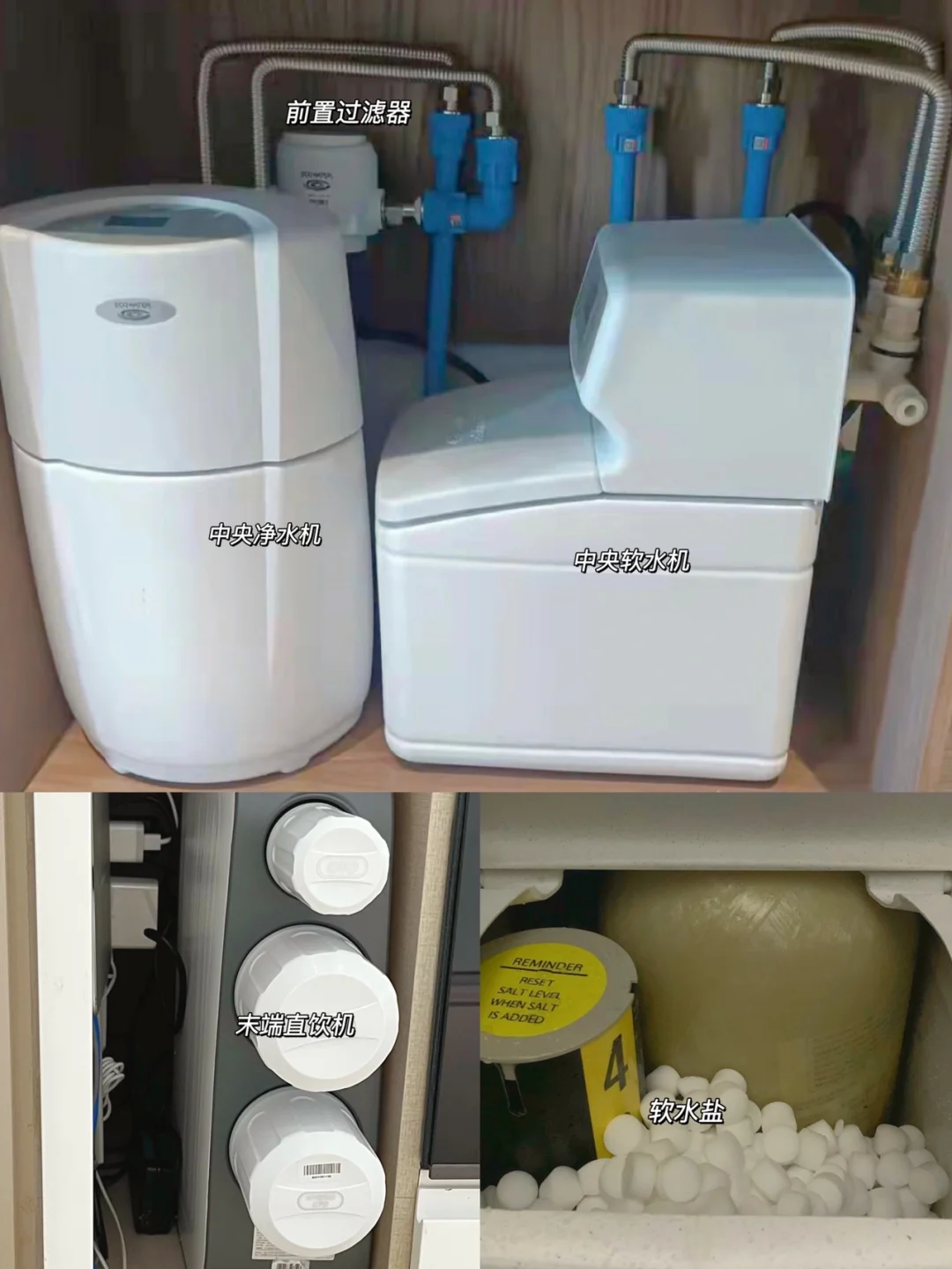🍃安装位置上呢,中央净水机和中央软水机一般都是连着装在一起,软水机在净水机之后,我家是三口人,选的都是常规款,体积比较小,不会占用太大空间。