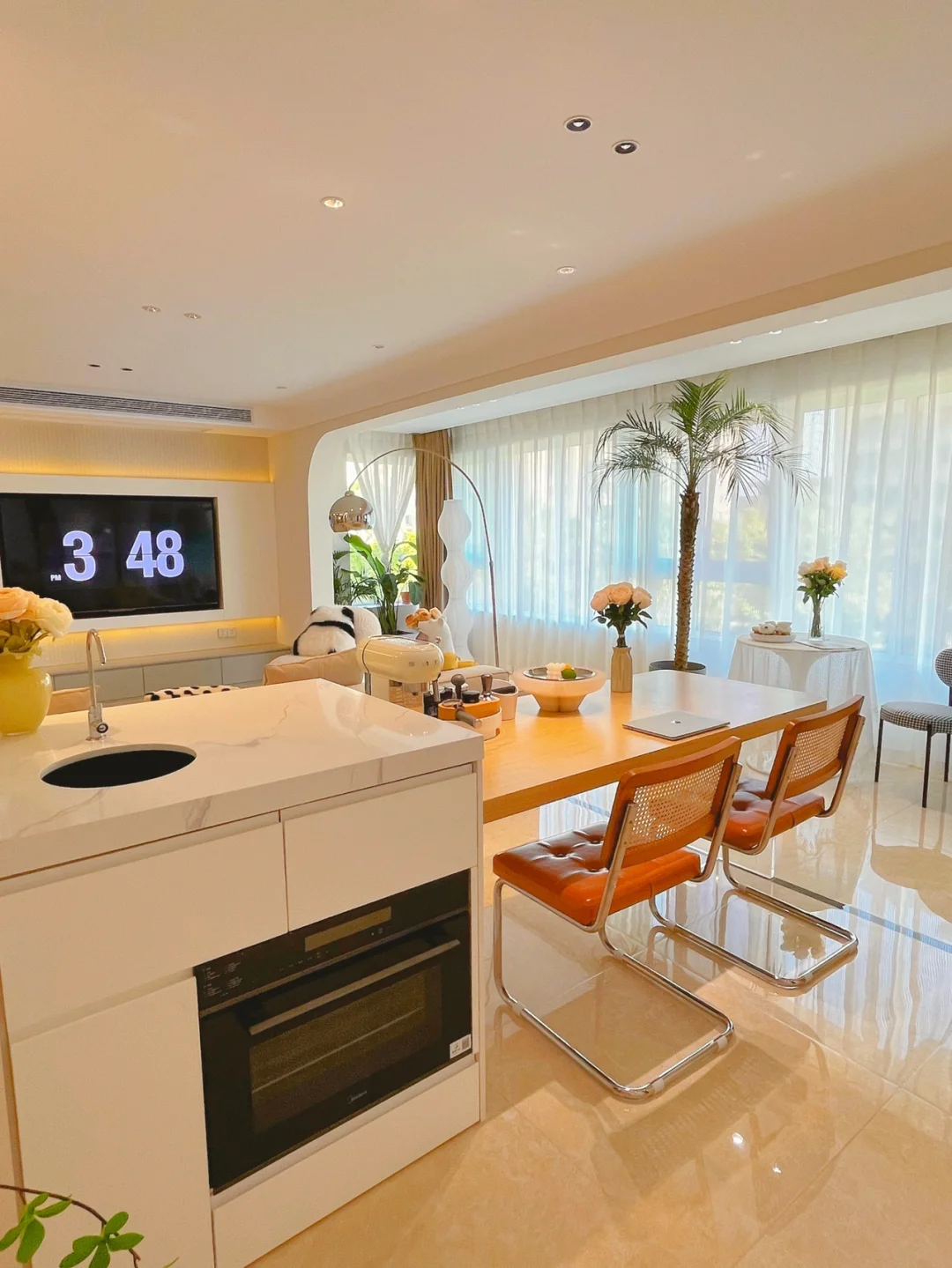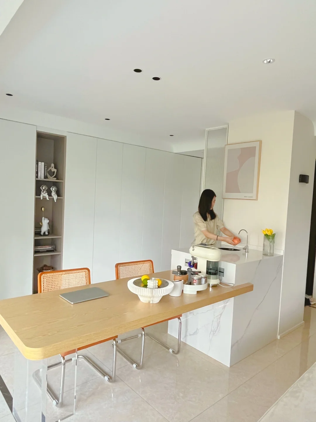 沙发后面砸掉了一间房,做成了岛台和办公烘焙区