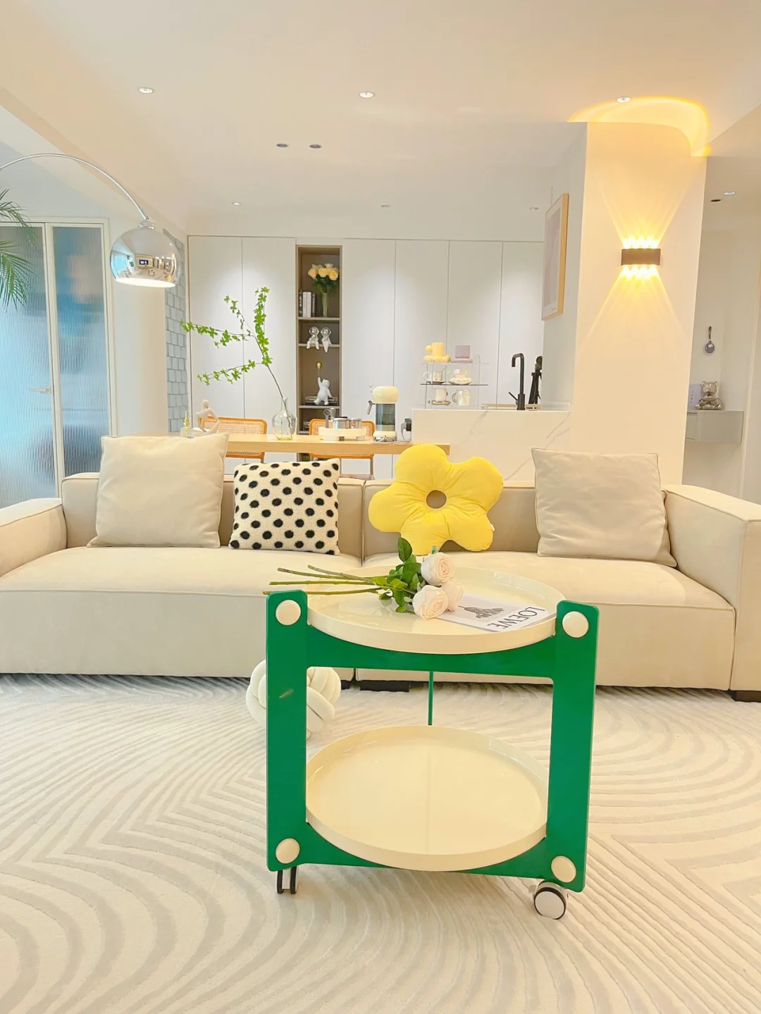 最近换掉了客厅笨重的茶几,选了一个奶油色+绿色的小推车,既可以当茶几,也可以当个小推车很方便。