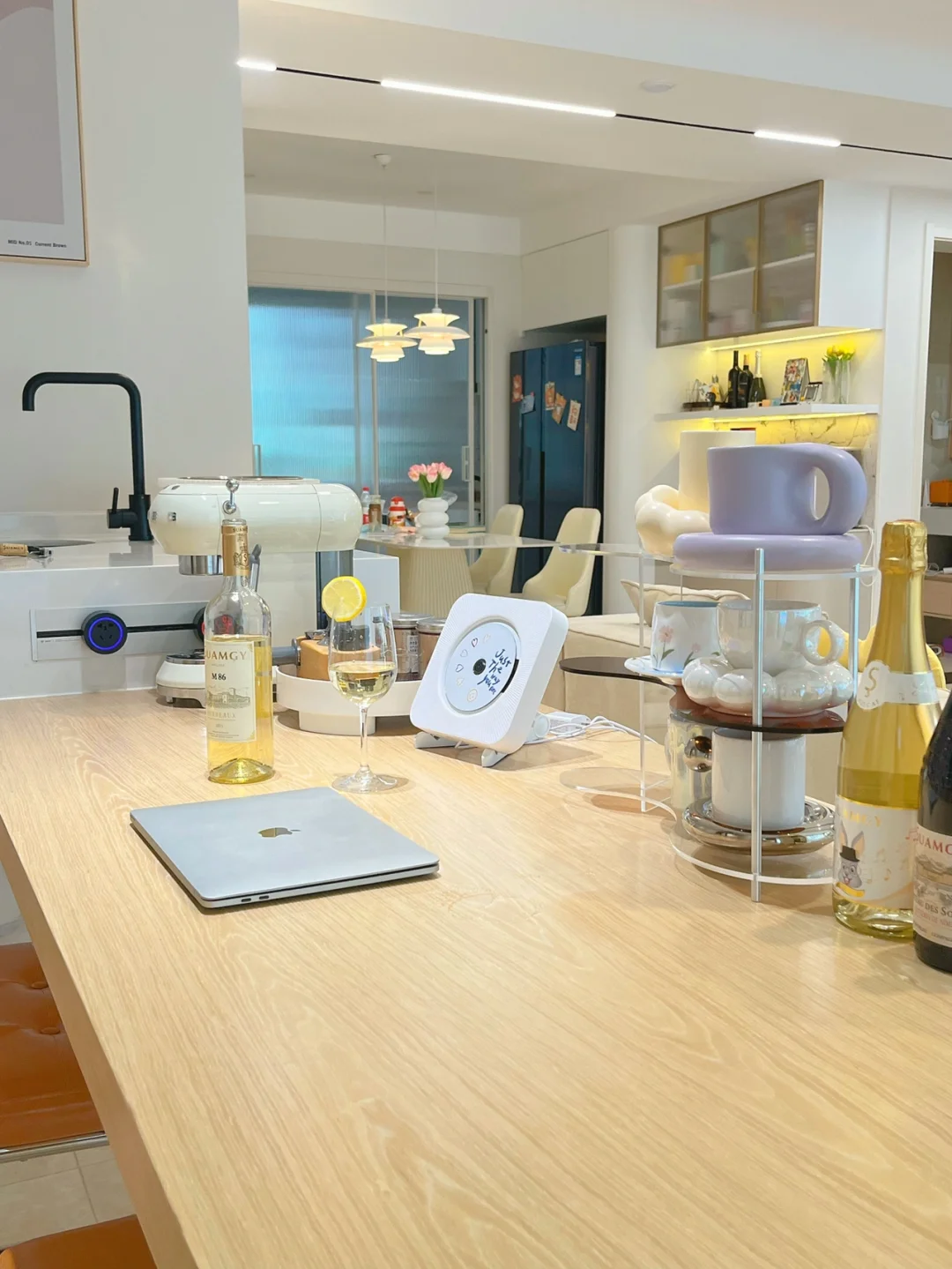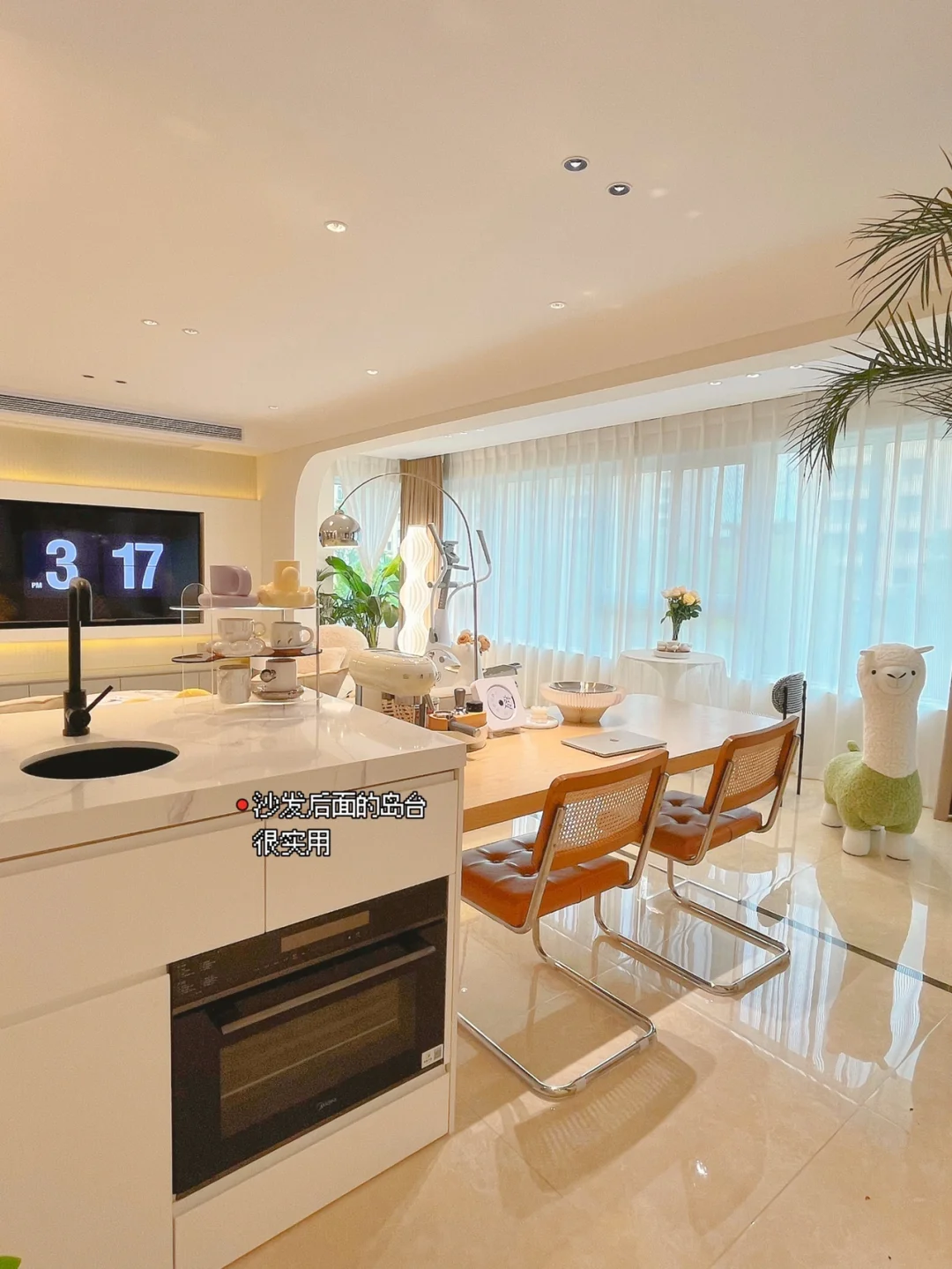 砸掉了一个房间,把客厅变成的大横厅,原来房间做了一个岛台+桌子,既是水吧台、烘焙角,还可以办公、聚餐,邻居直呼太实用!