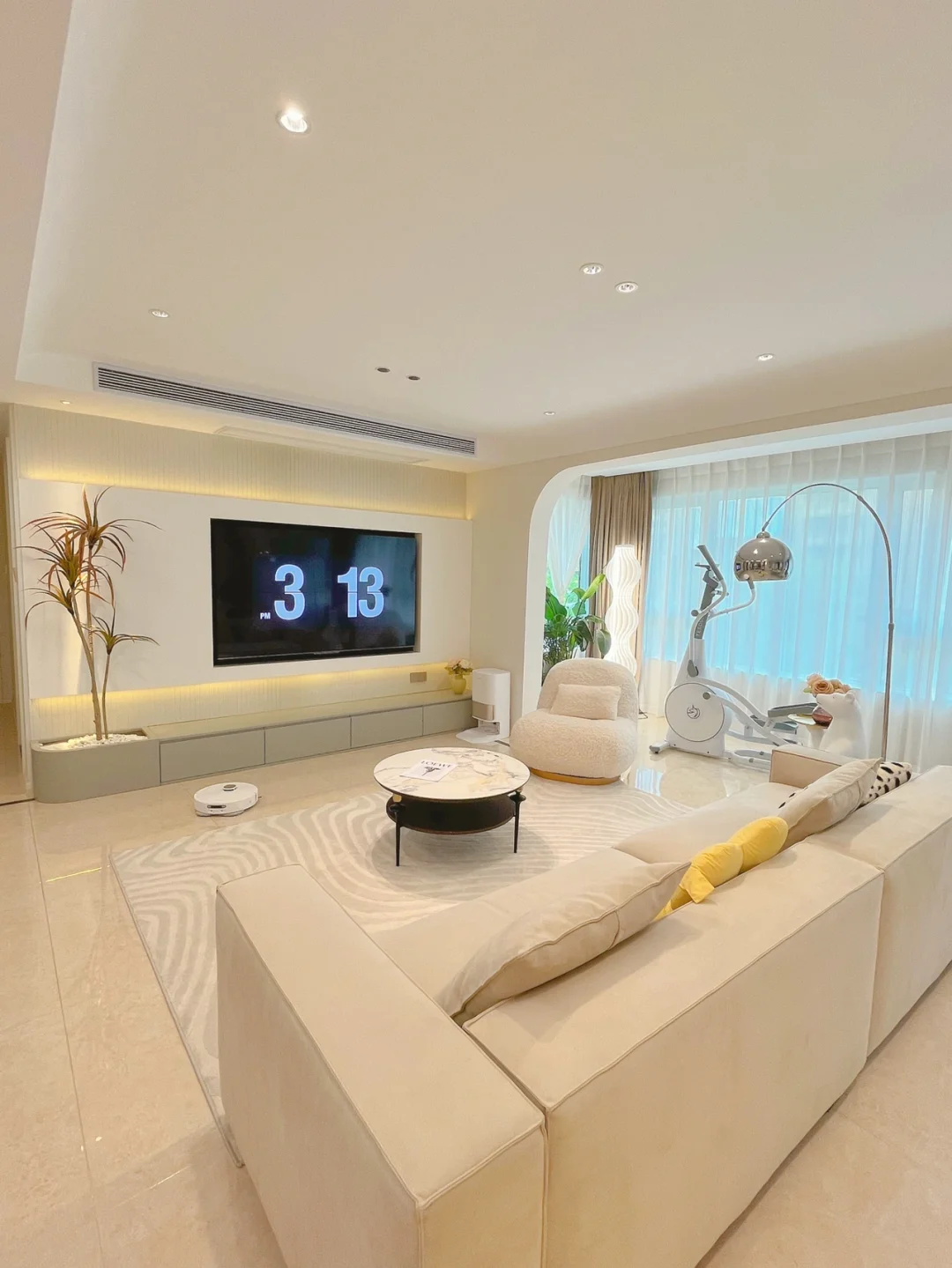 装修抛弃了流行的黑白灰配色,选择了暖色系,地砖是原来开发商精装的,米黄色的还比较好看,就补买了阳台的部分,和客厅通铺,地砖通铺也方便卫生打扫。因为工作比较忙,家里的清洁使用全自动的扫拖机器人可以省下很多时间。除了常规的功能外,大家可以选择像我家这台带自动集尘、能自己加清洁液、自动洗拖布的机器人哦。不在家也可以手机控制直接做清洁真的很方便。