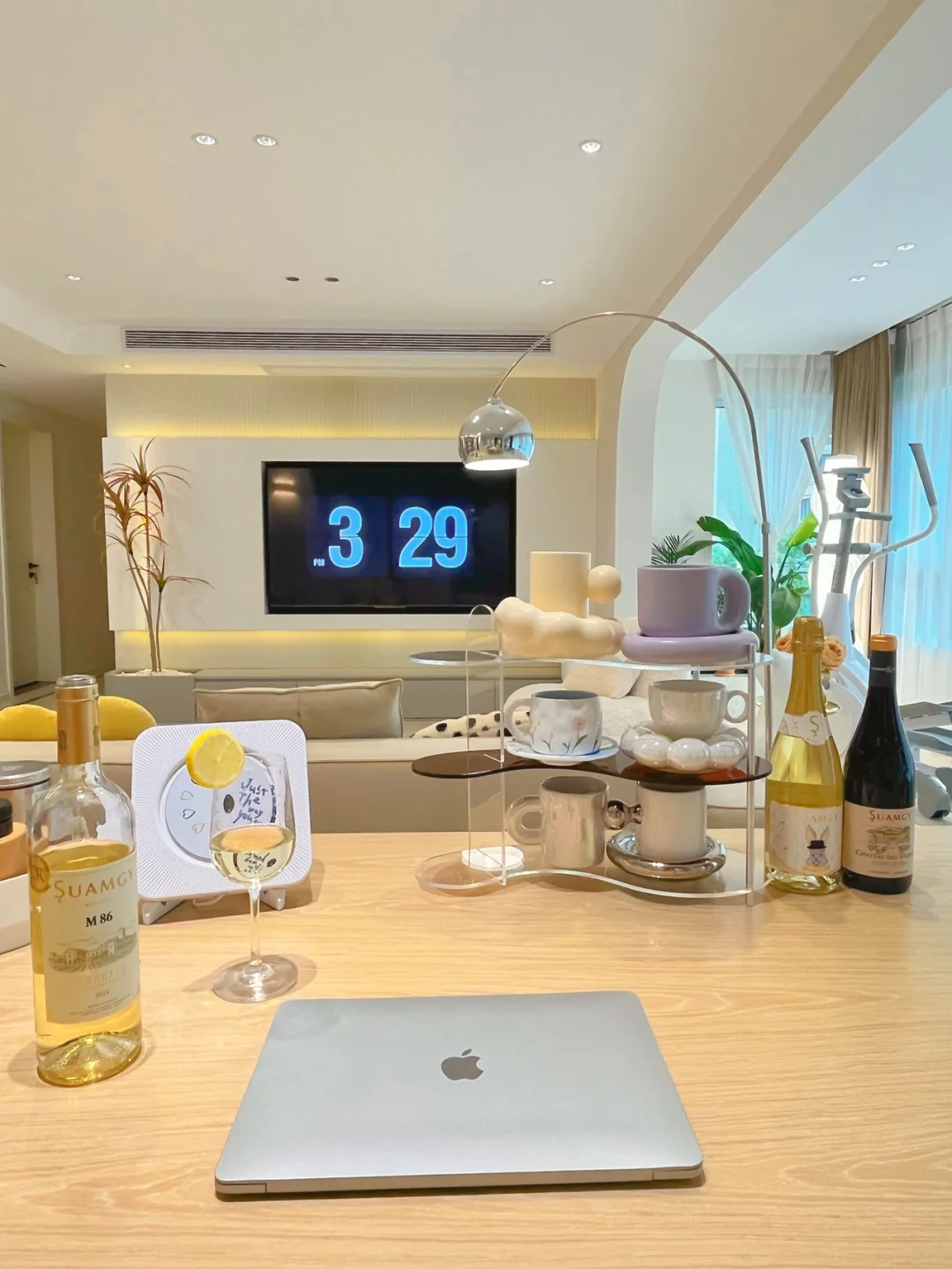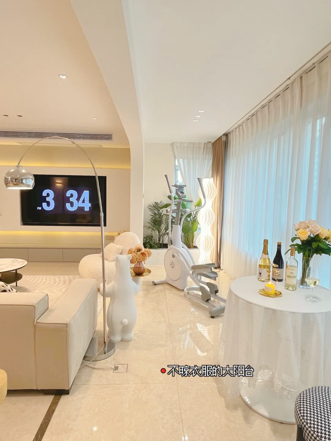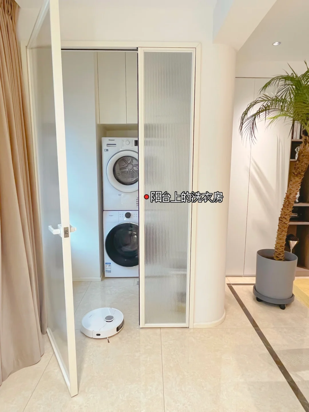 我家只有南面一个大阳台,我把客厅和阳台打通了,在阳台的西侧用玻璃砖和长虹玻璃门隔出了一个1平米多的洗衣房,做了个小小的家政柜,放了洗烘套装,还装了个小电动晾衣架,方便又美观,不晾衣服的大阳台真的太舒服,闲来无事坐在阳台上开瓶白葡萄酒,浓郁的水果香气可以静静地享受独处时光,入口细腻柔和,适合女生独酌~这应该是我家装修最不后悔的一个设计了!