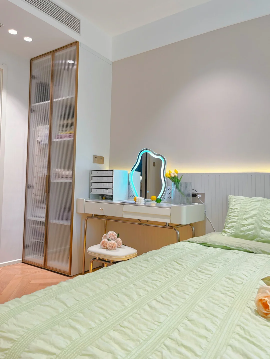 ▫️左侧是梳妆台加一个透明衣柜 一般用来放睡衣浴巾包包或者次净衣之类的