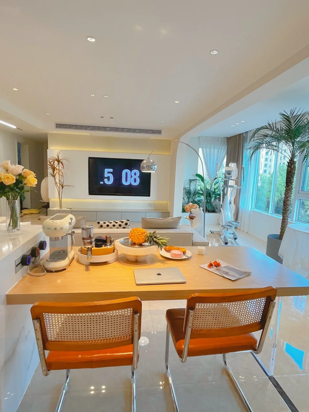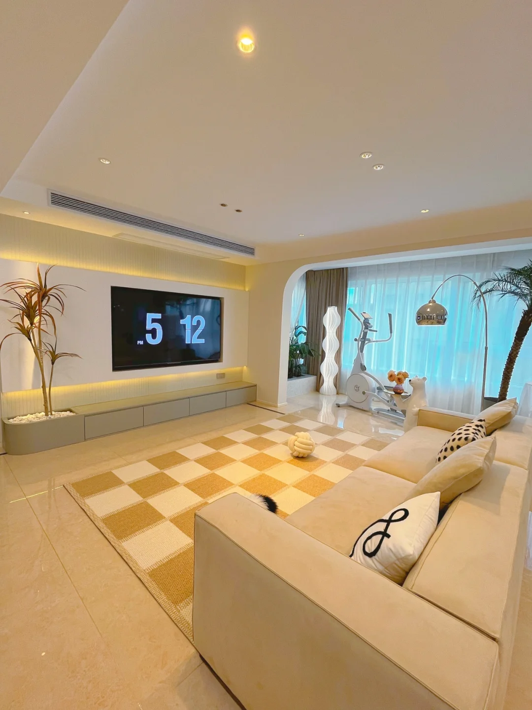 客厅区域选择了无主灯,色温4000K,30个筒灯、射灯,你们之前一直问我无主灯会不会暗 其实用了无主灯以后客厅各个角落光线都很均匀,不会有明显暗区,既明亮又不压层高,自然显得更开阔