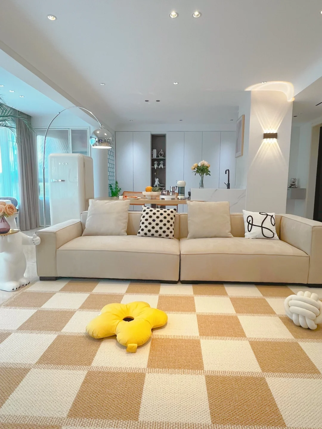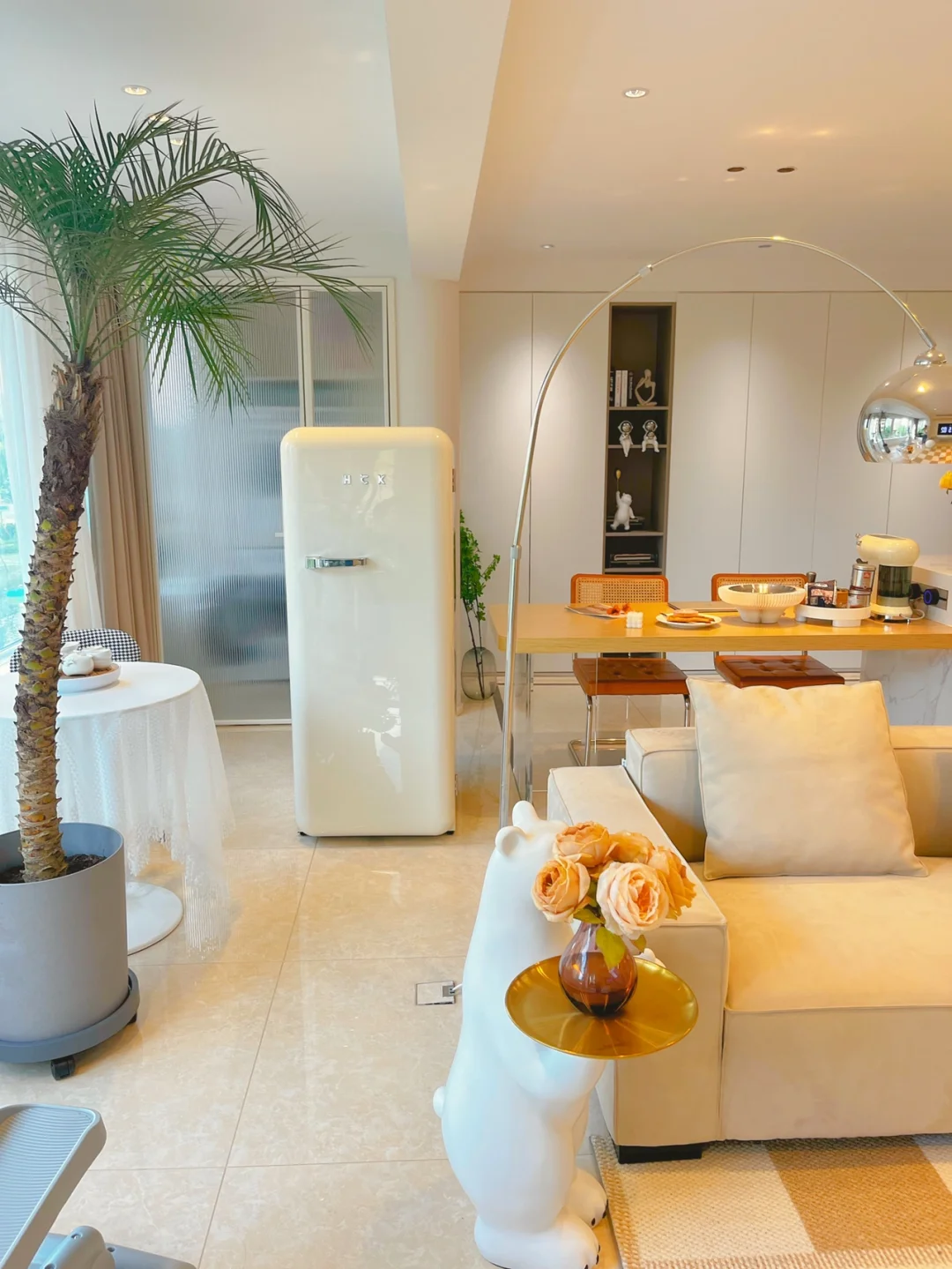 在岛台办公区旁放了一个复古冰箱,奶黄色的萌萌的!