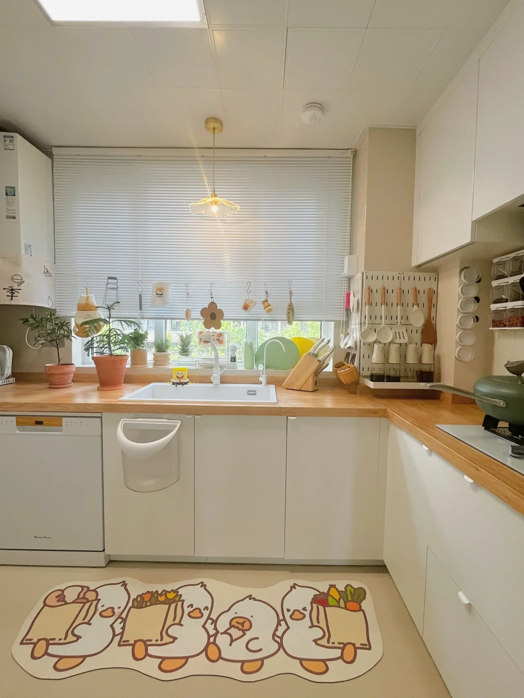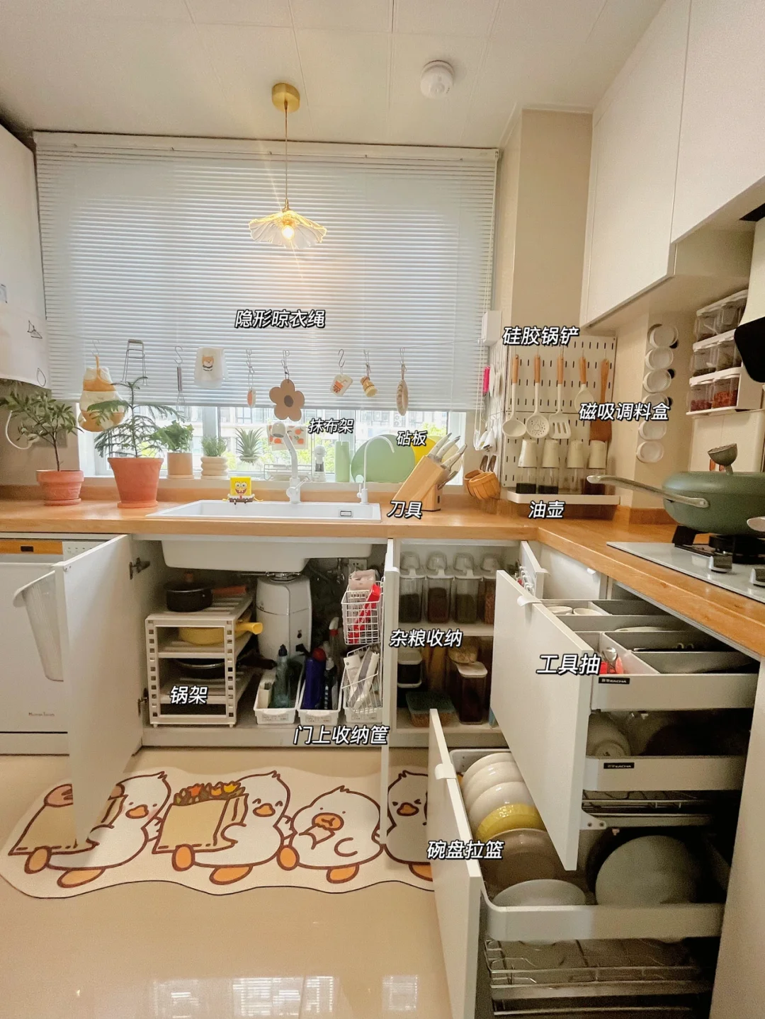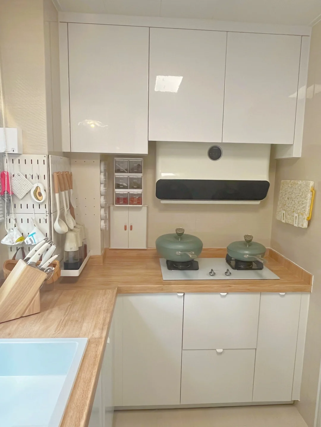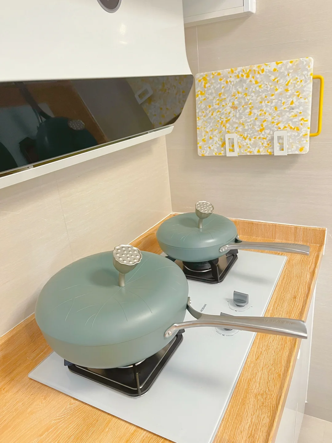 厨房尺寸5平米 能上墙的都上墙 全部都是免打孔的哦 台面空无一物真的很棒! 新入的炒锅,颜值在线,锅盖像荷叶,好特别呀! 平时爱用的这套刀具,奶油色,颜值高又锋利哦! 看图抄作业吧! 锅-繁花烙荷叶不粘锅 刀具-海鸥拓牌