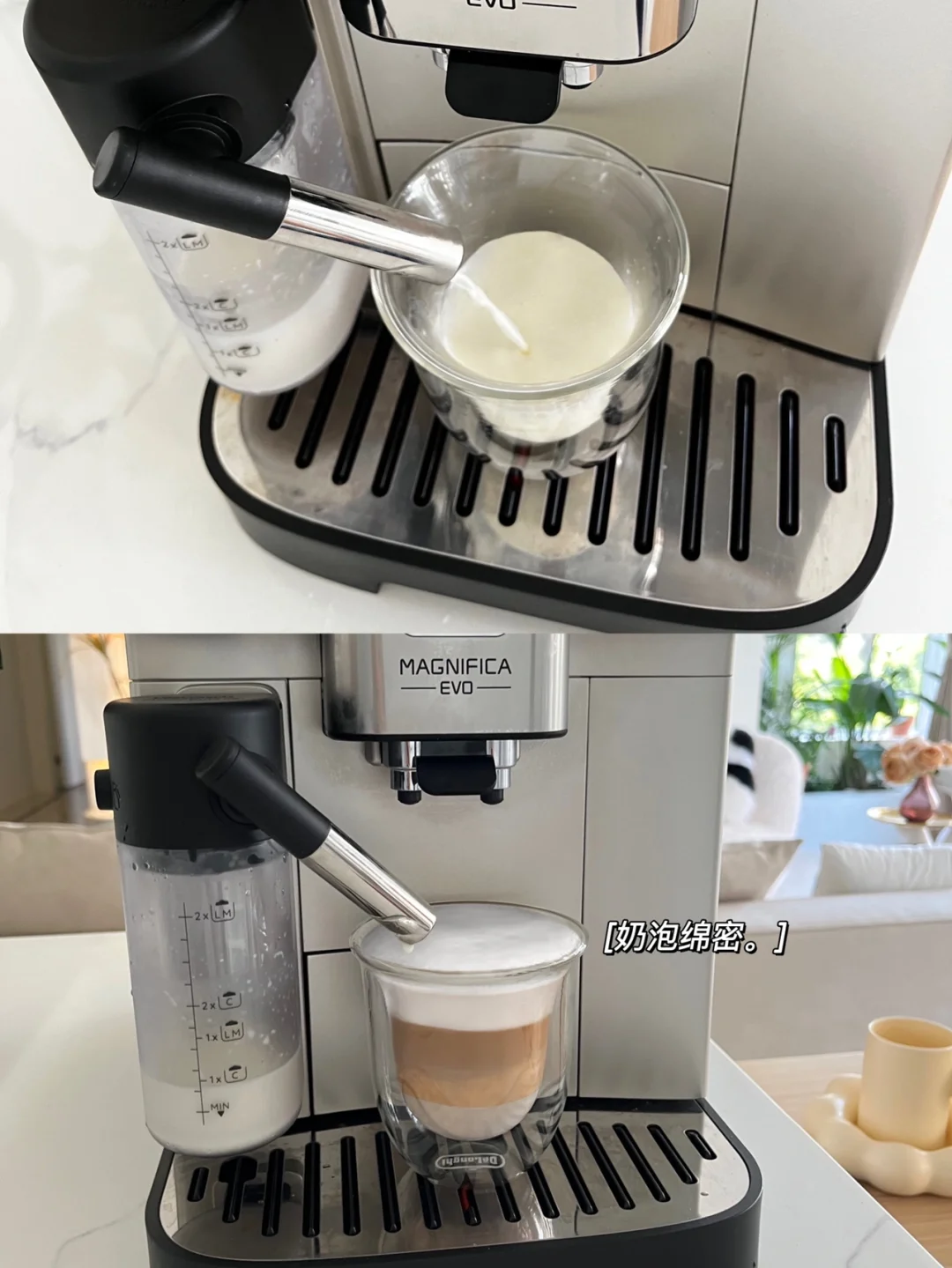 ✨还有些咖啡爱好者喜欢奶咖,但苦于不会打奶泡,有了这款机器,咖啡小白也不用担心了,德龙的LatteCrema奶泡系统可以自动打出绵密奶泡,卡布奇诺,拿铁一类的奶咖制作都变得很简单。还有全新的迷你奶缸,可以一次性制作1-2杯奶咖,也不怕浪费了。