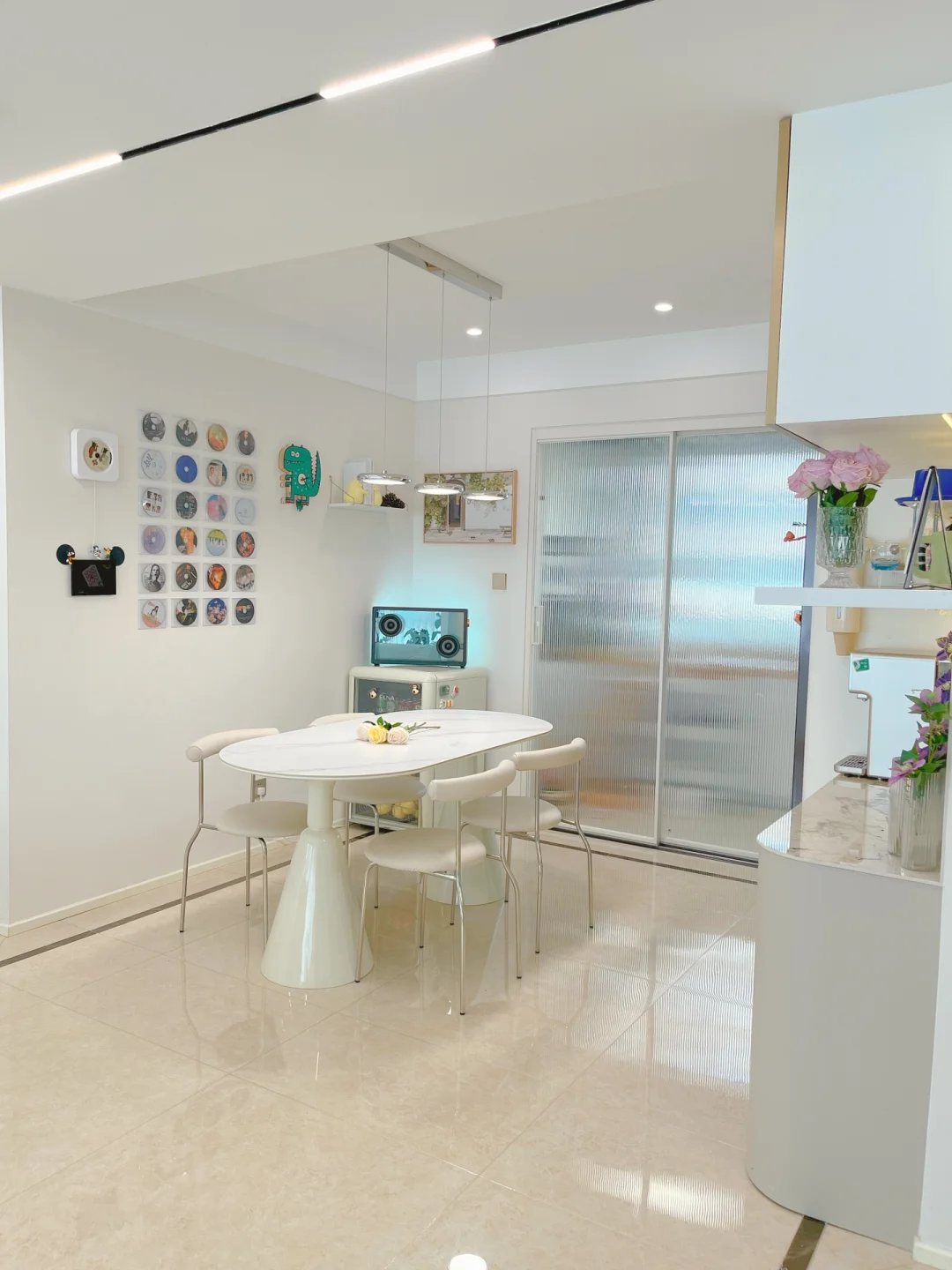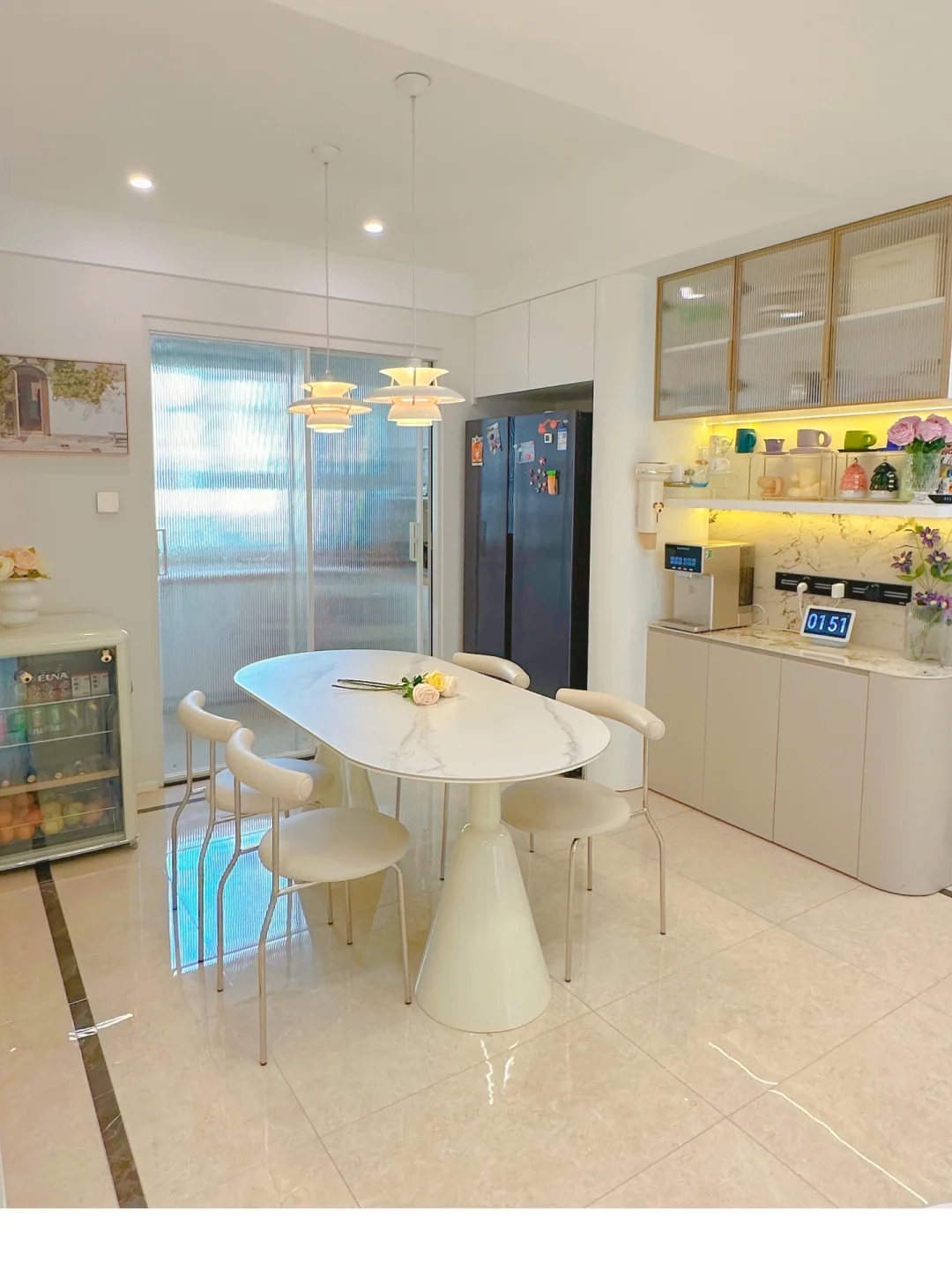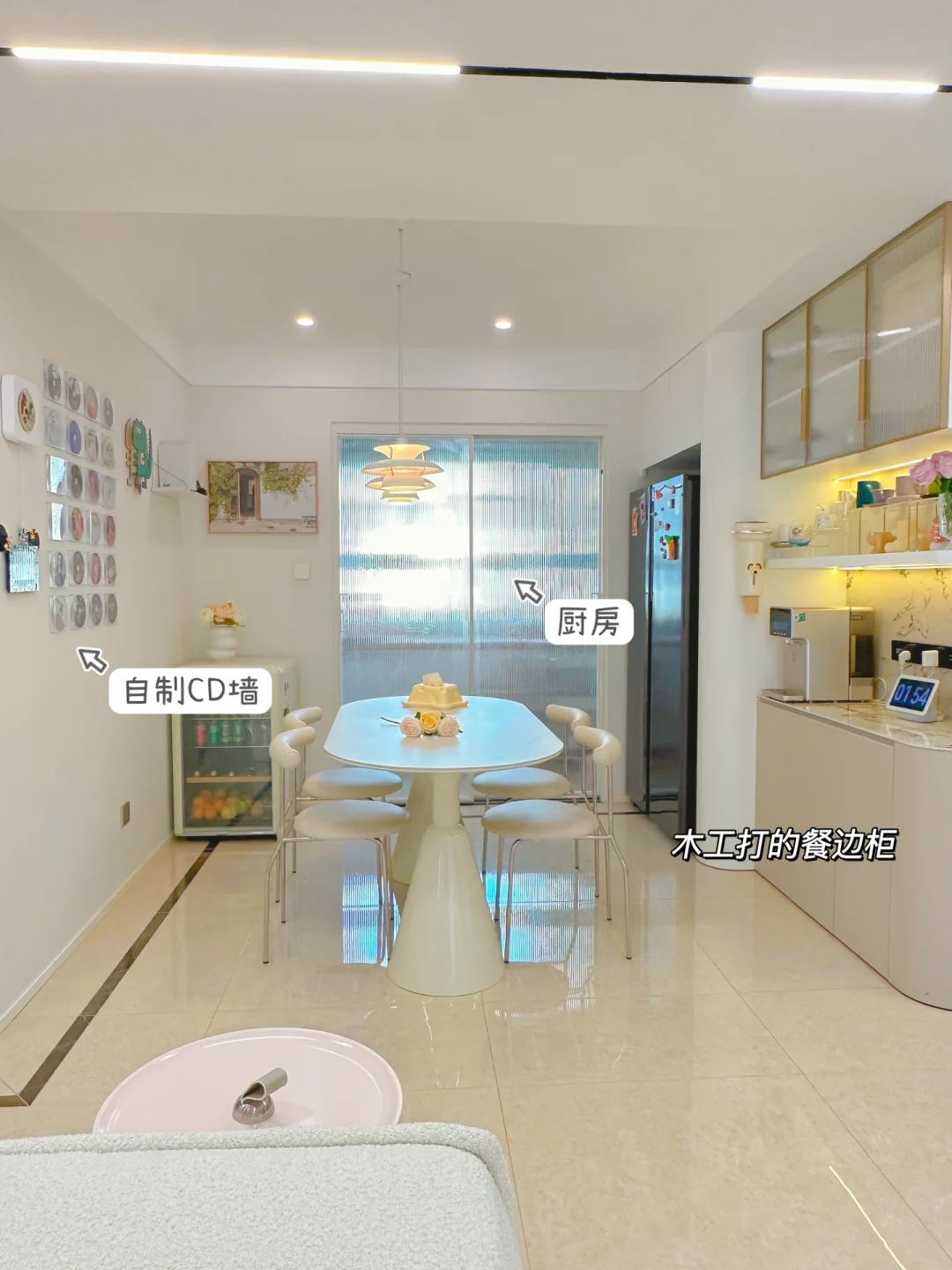 装修一切从简 没有复杂吊顶 不做复杂电视背景墙 全屋杏子灰乳胶漆通刷 这样的家也很好‼️ 重要的是硬装才4W‼️ 餐厅选择了一套造型独特的餐桌和餐椅 奶油色的很喜欢 1.6m长很适合我们一家三口 也让普普通通的餐厅变得没那么普通啦~