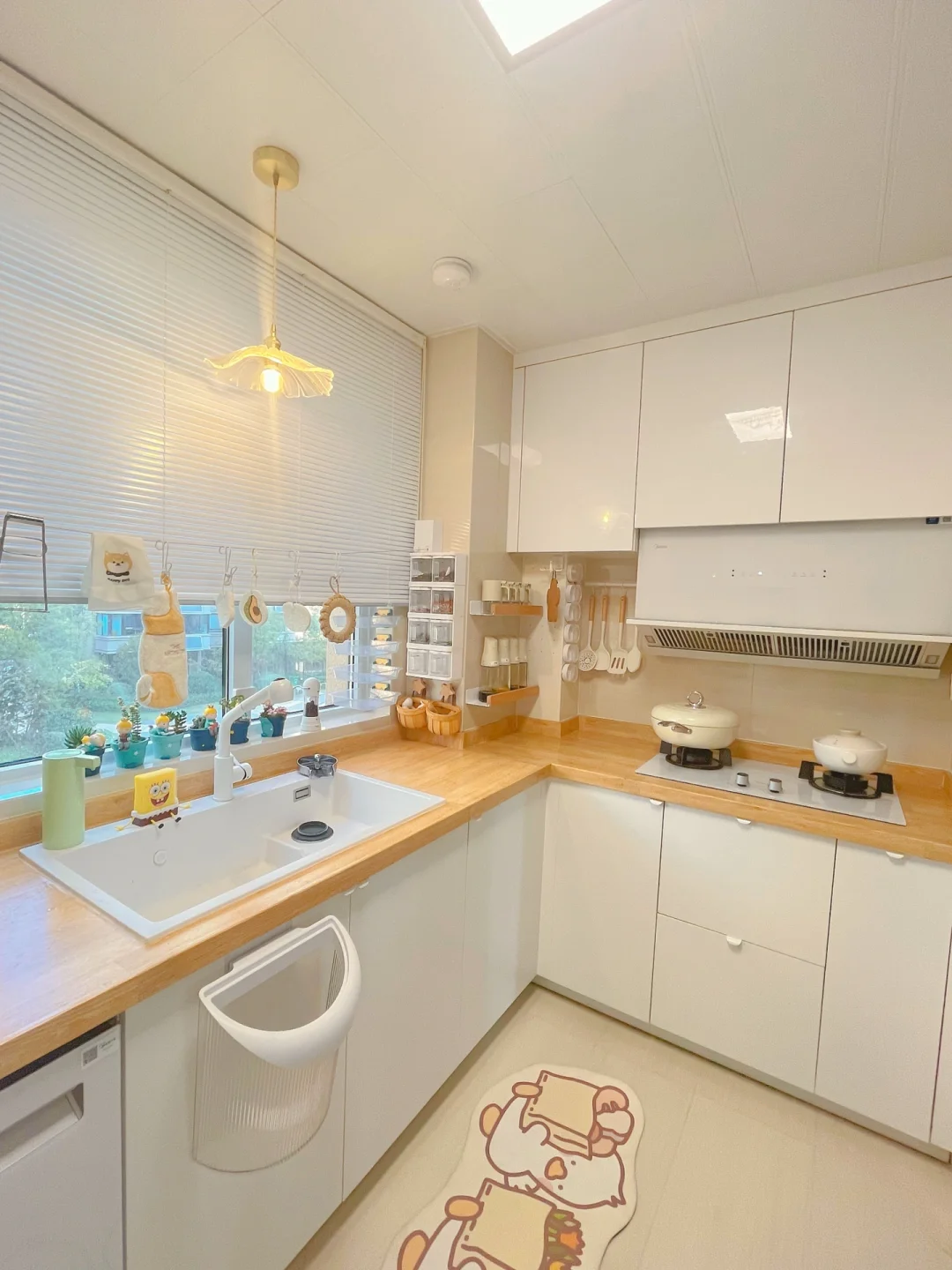 厨房原来是精装房自带的,收房后花小成本稍微改造了下:台面贴了木纹色的贴纸,换了白色的柜门,冰箱位改成高柜,小成本改造的厨房收纳和颜值一下子就高了!
