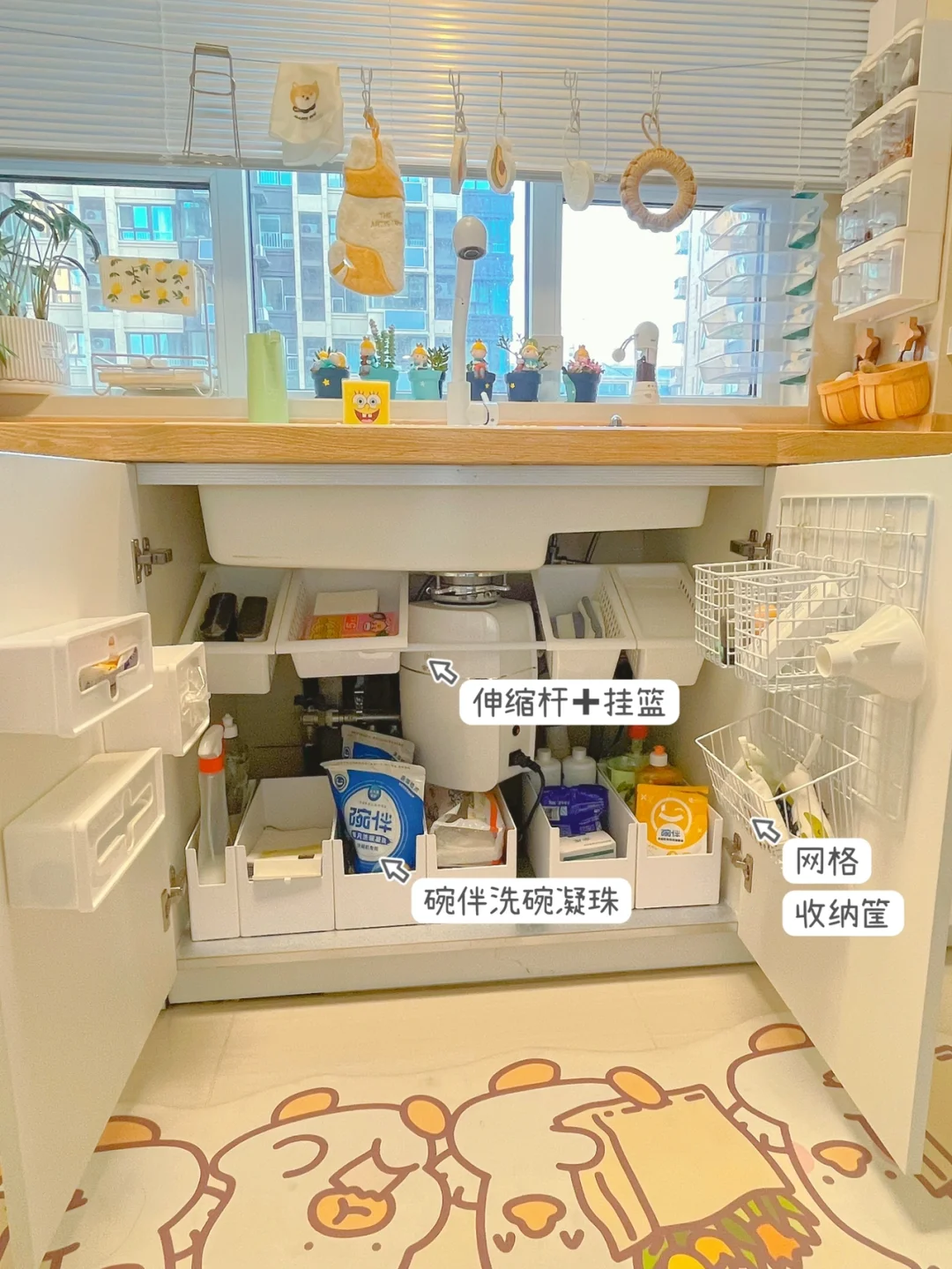 门板正面可以挂垃圾桶 背面粘几个收纳盒,放一次性手套、保鲜袋这些