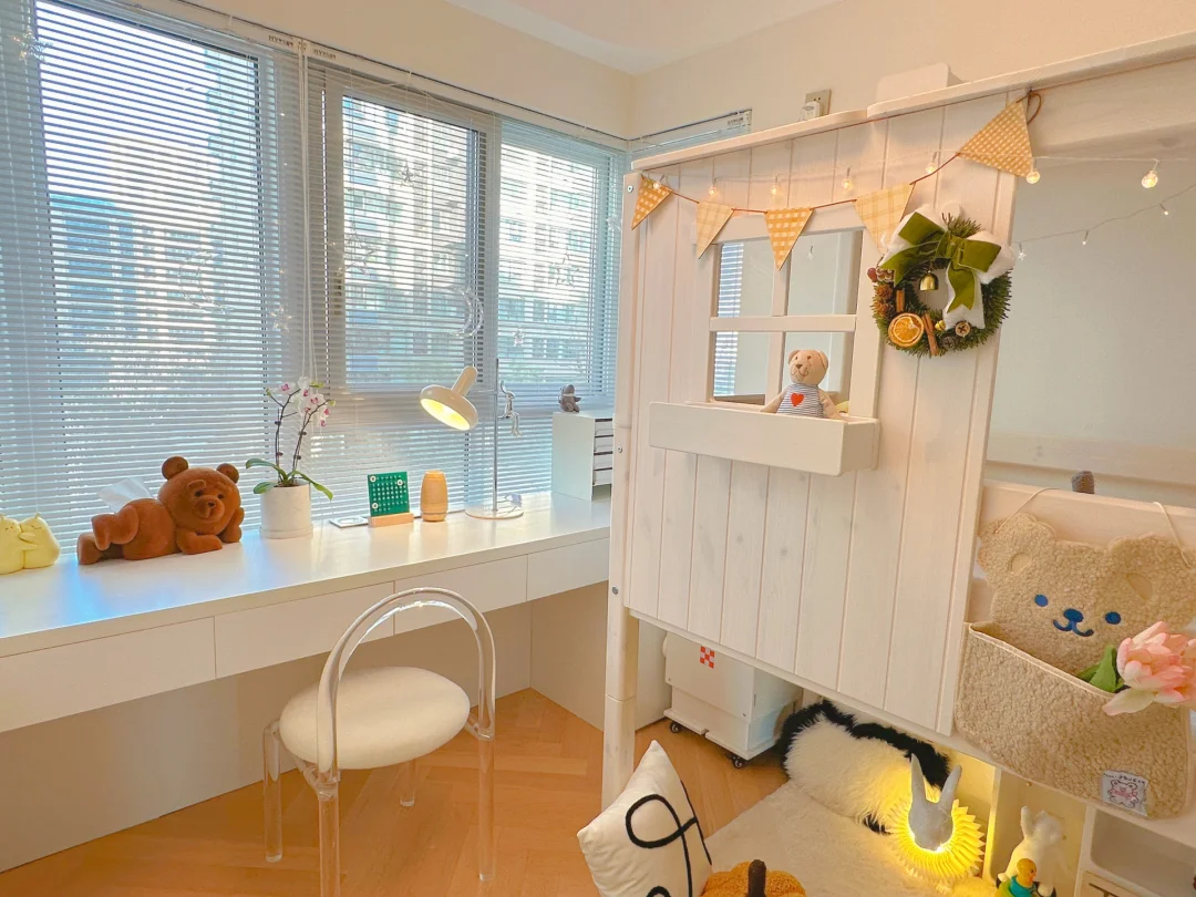 同样的户型,这个8平方小房间邻居们大部分只放了一张儿童床,没想到我不仅放了张树屋儿童床,还做了一面墙的大书桌,还做了书柜+衣柜。邻居看了都惊呼,这真的会设计,没想到小小一间房能有这么多功能!