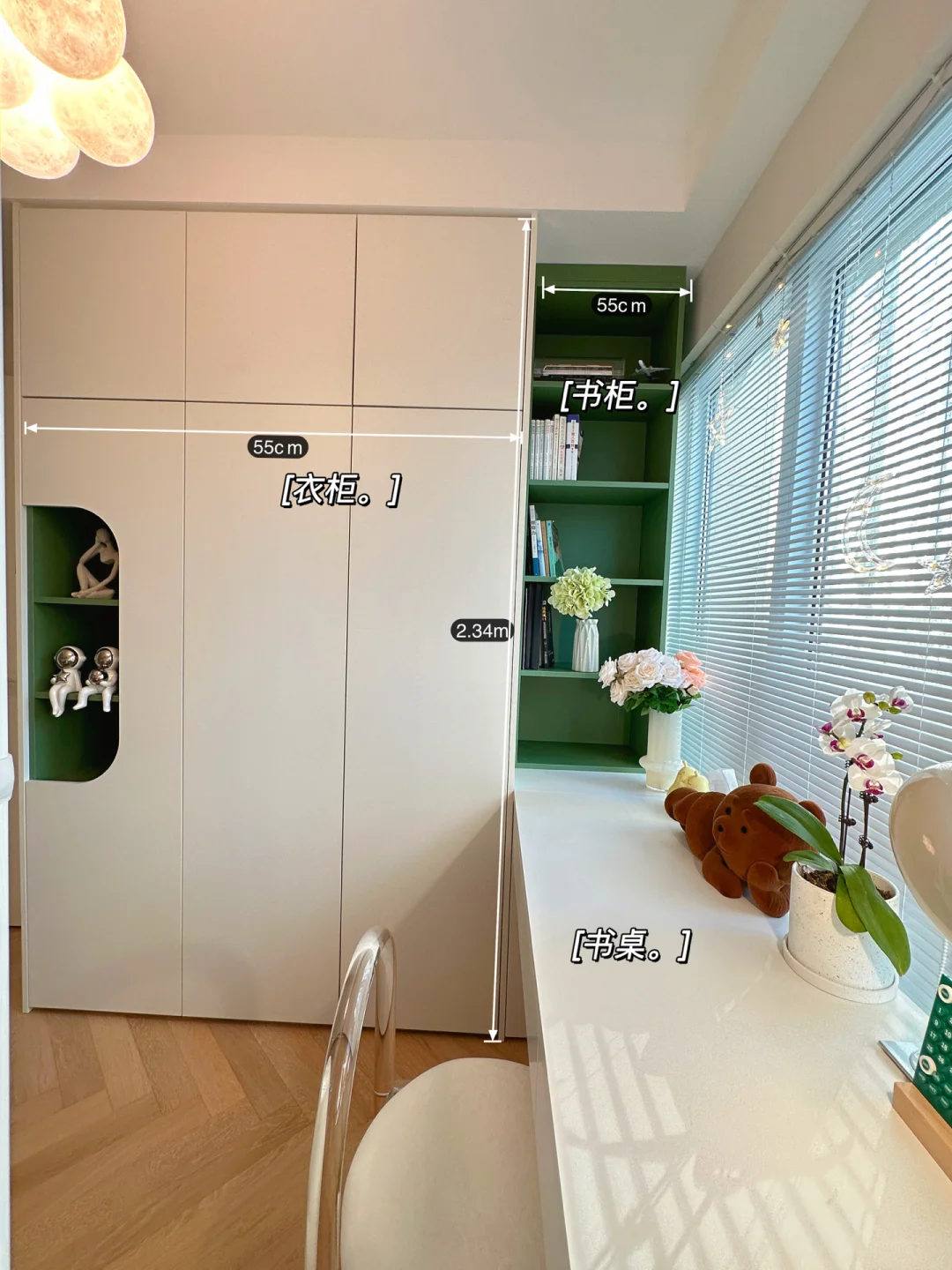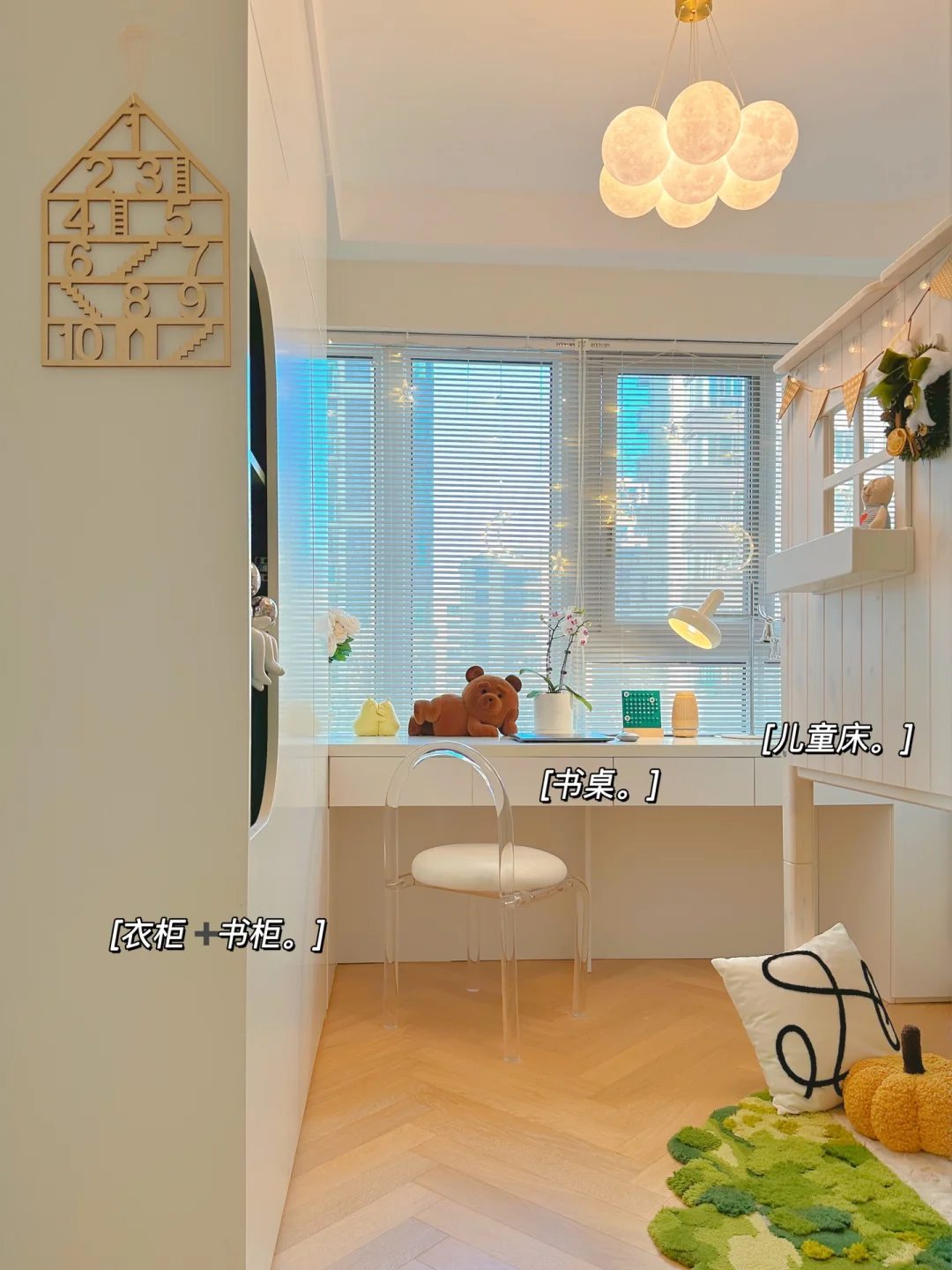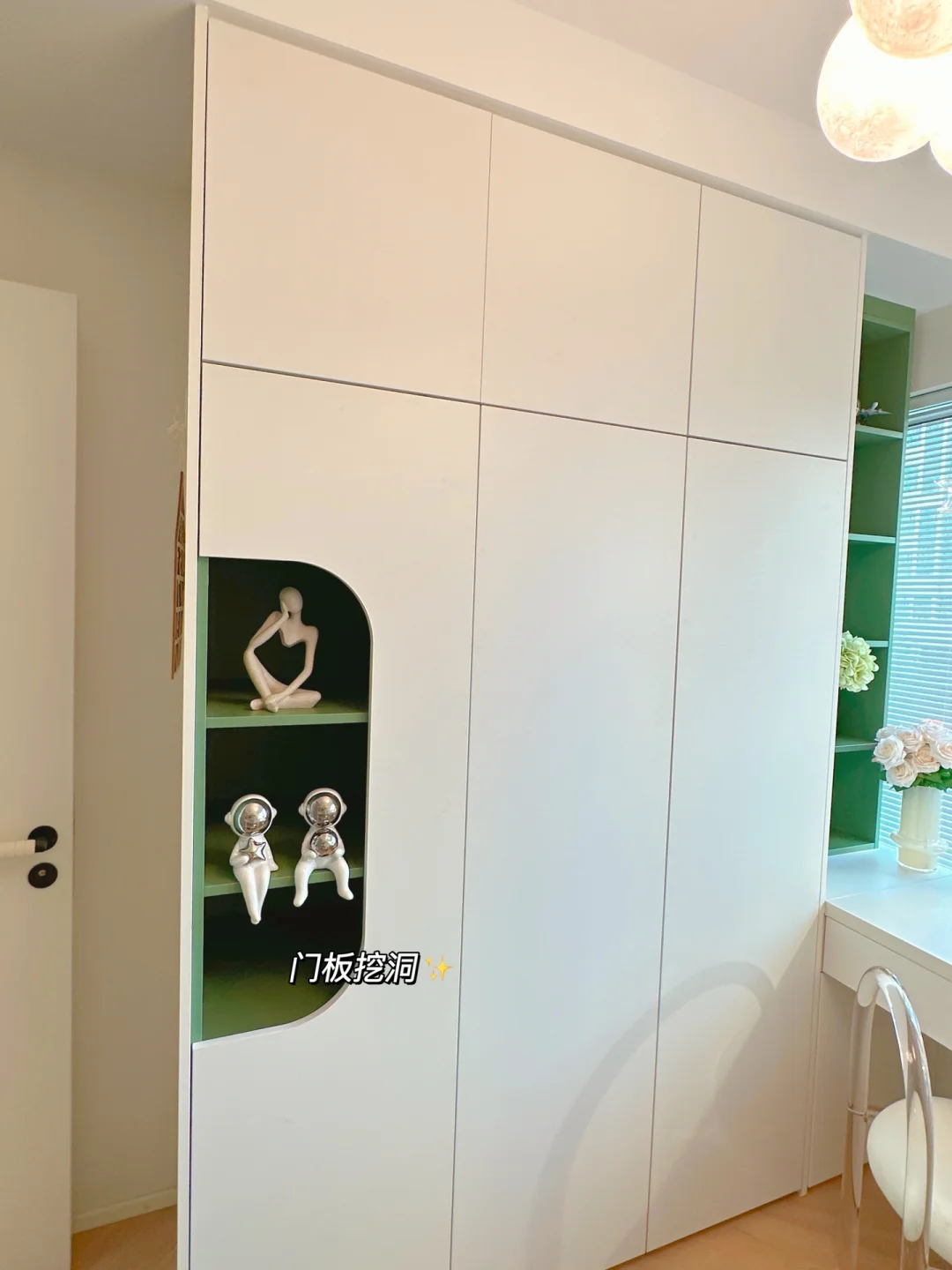 ⭐️侧面是一个2米长的衣柜,主要是用来放小朋友的衣物,储物空间是够了。考虑是作为儿童房,所以在柜门上动了点心思,挖了一个圆弧,露出里面的绿色柜体,让房间生动不少。