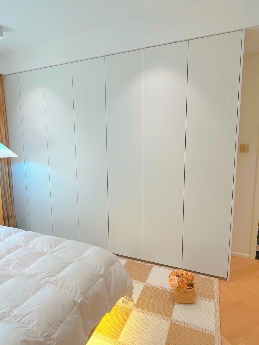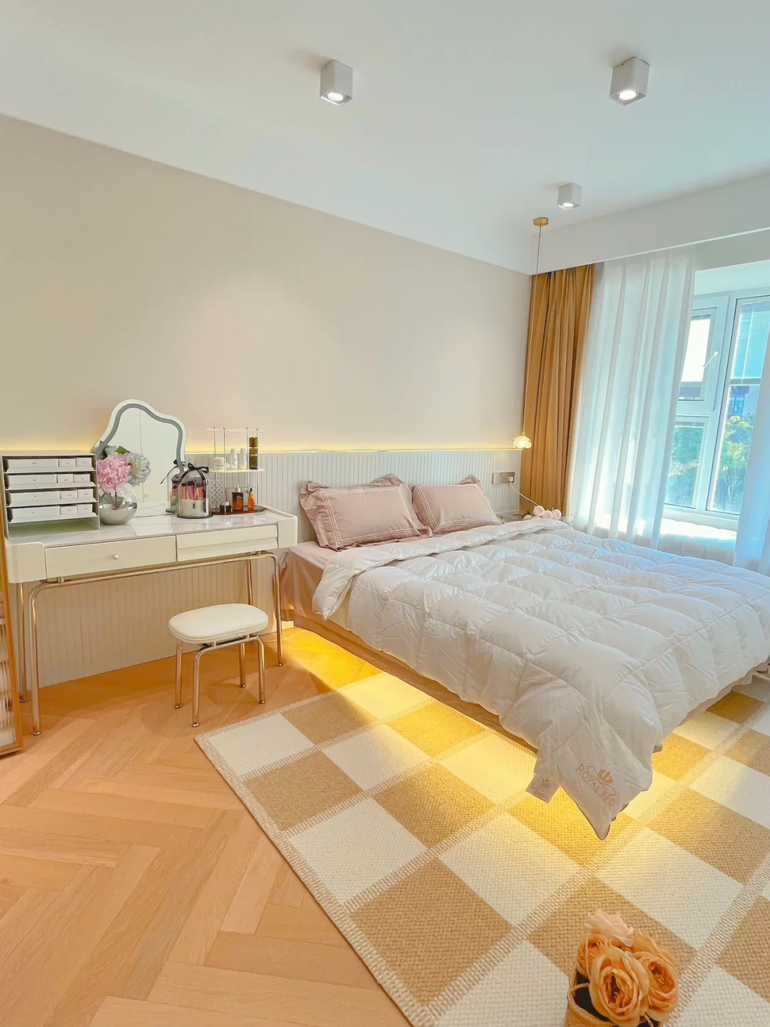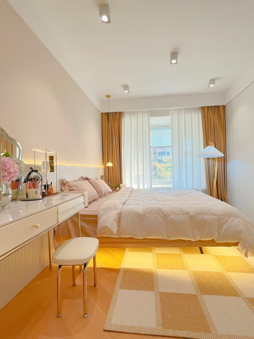 ✔️选择无床头的悬浮床,节省床尾空间,做一排床尾柜