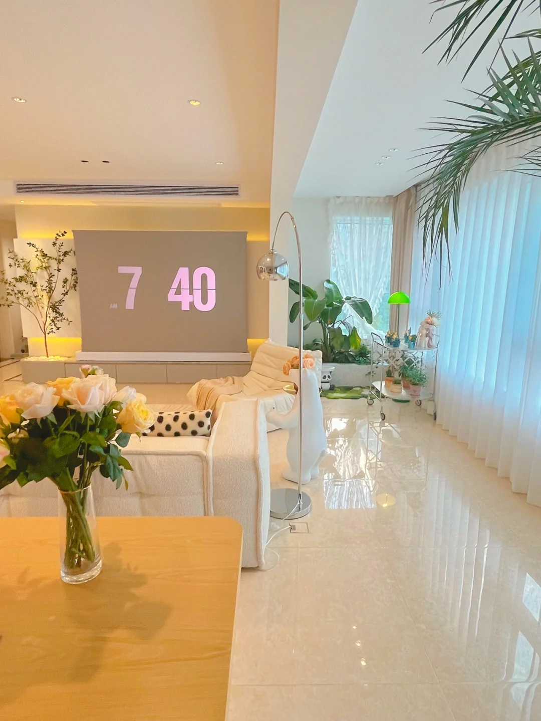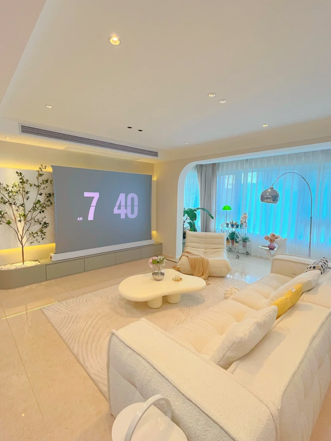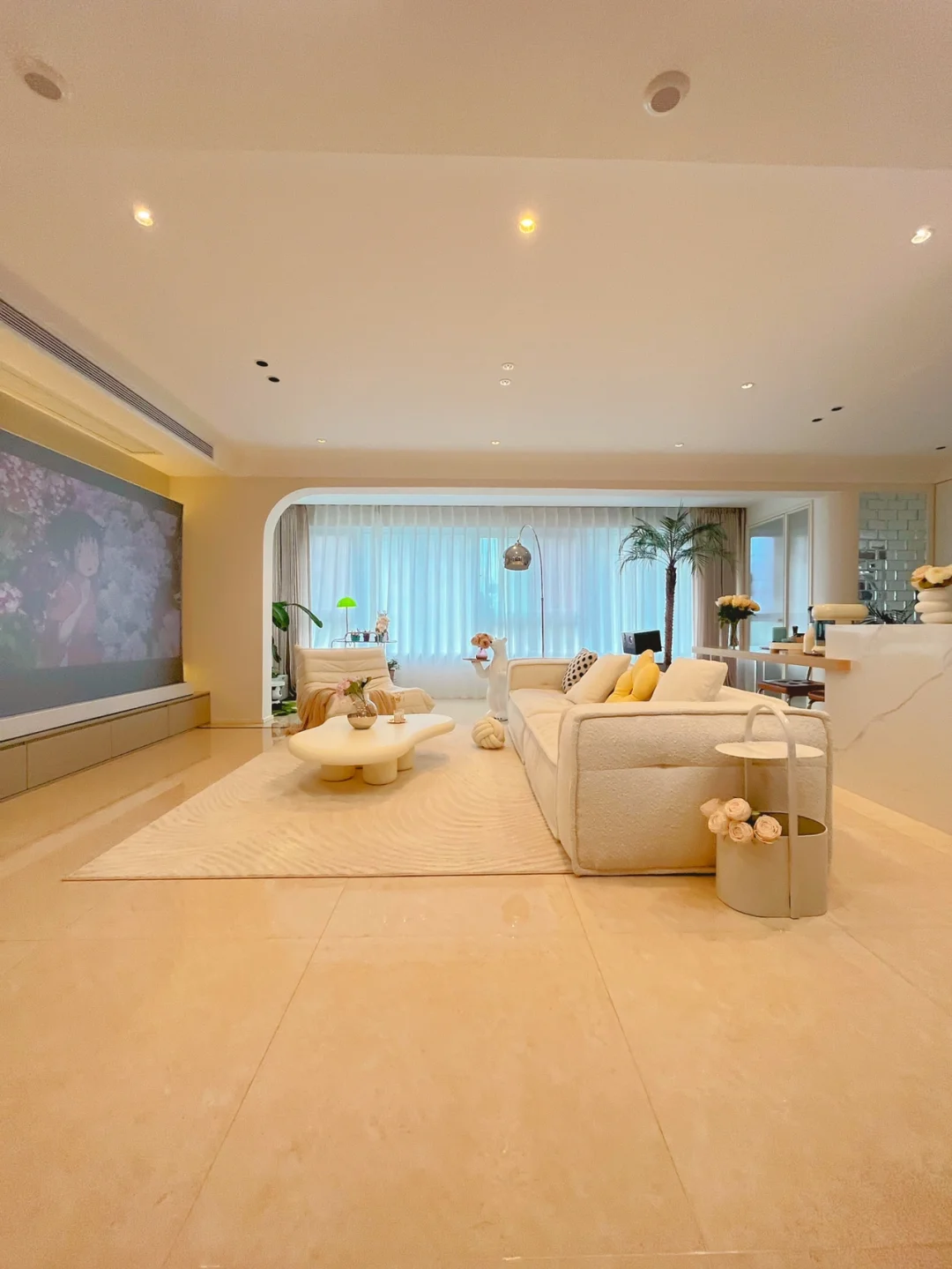 拆除了原来复杂吊顶,客厅做了平顶,嵌入无主灯,见光不见灯的感觉让客厅既显层高也显大,无主灯选择深度防眩,加上一条磁吸轨道灯,非常明亮!