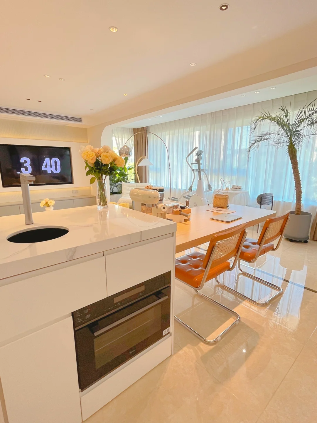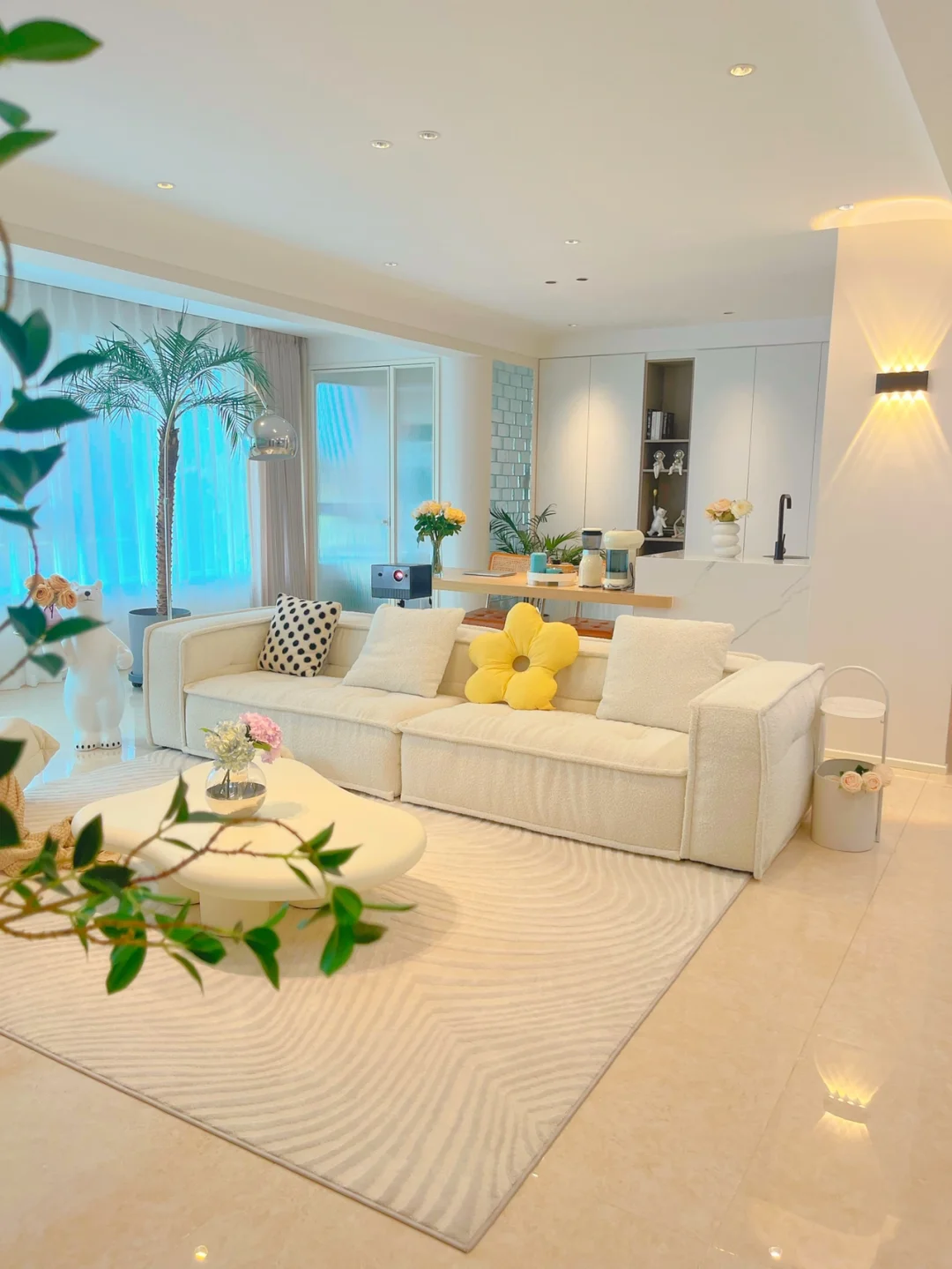 客厅牺牲卧室做了一个大岛台,在沙发后面,可以做水吧台、办公区或者大餐桌,超实用!