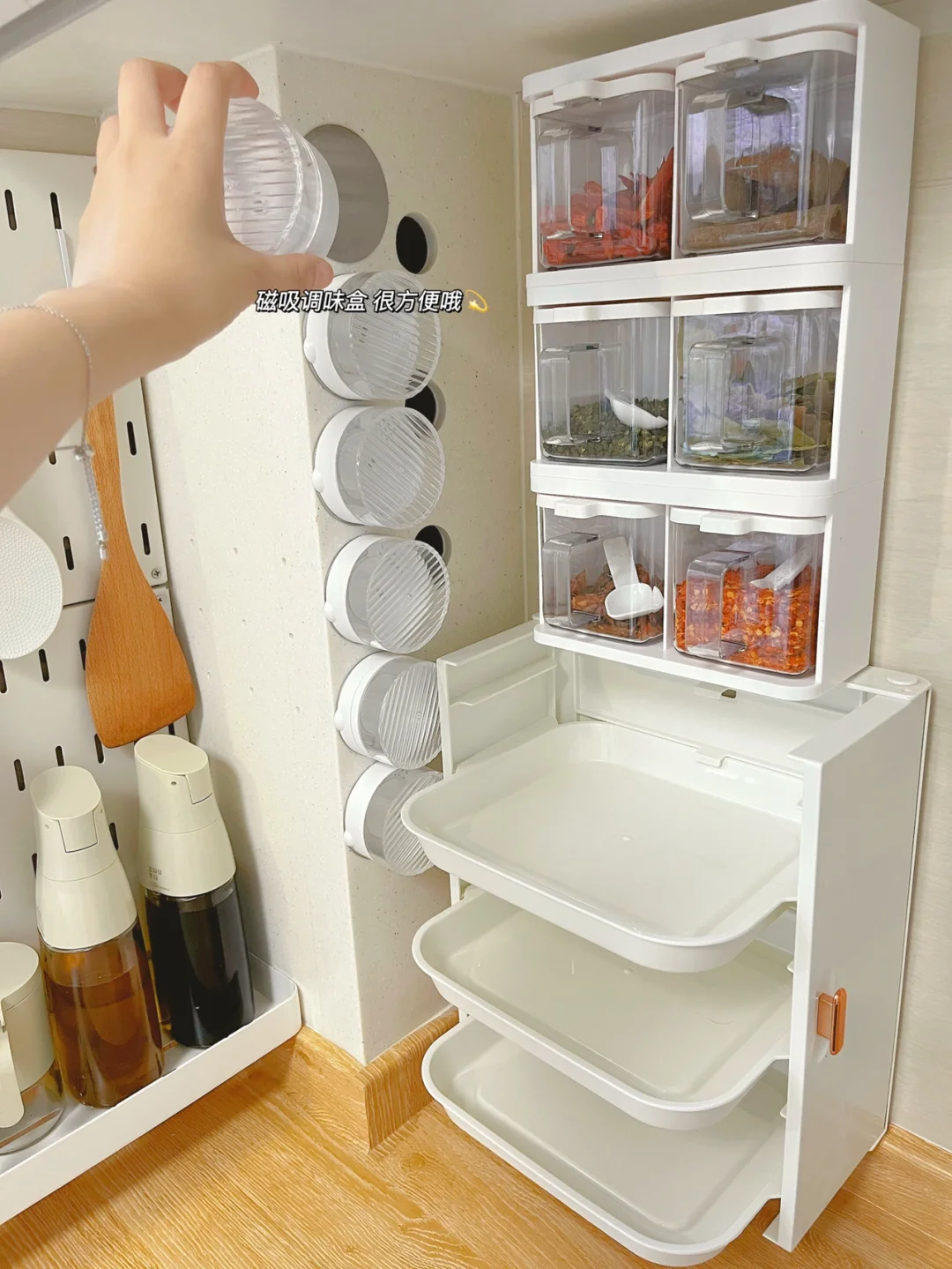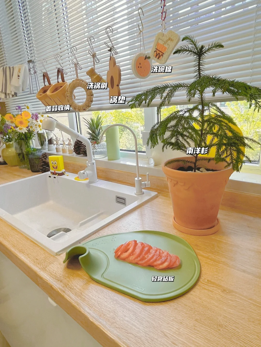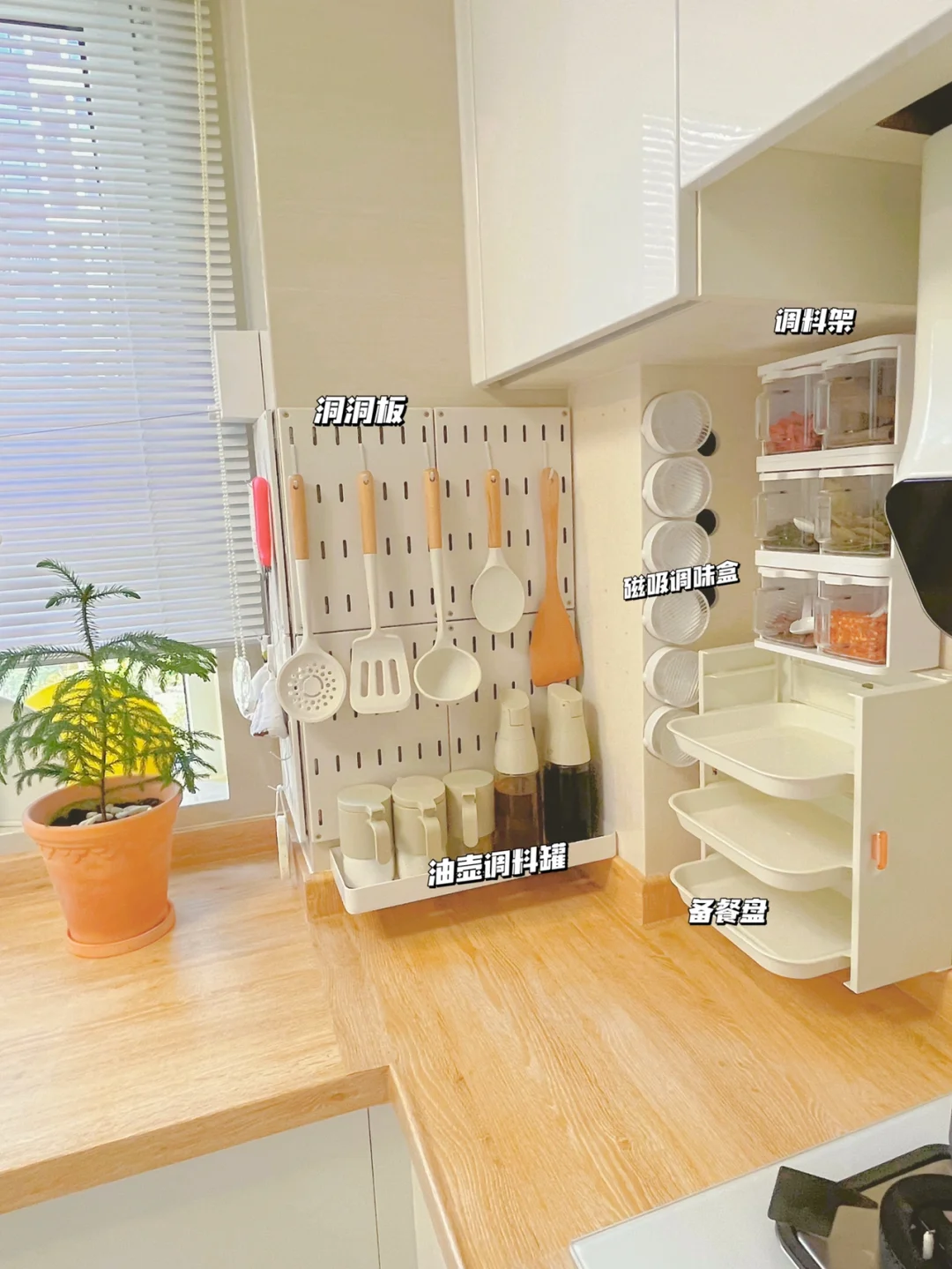 ✔️厨房收纳遵循能挂不放的原则,锅铲调味罐搭配洞洞板,统统挂起来,磁吸的调味品收纳盒正好放在烟道两侧,整齐拿取又方便!砧板准备了三块,生熟食分开处理,站立收纳不占空间!还有你们一直在问的备餐盘,今天打开了哦,平时炒菜放备菜是不是很方便呢!