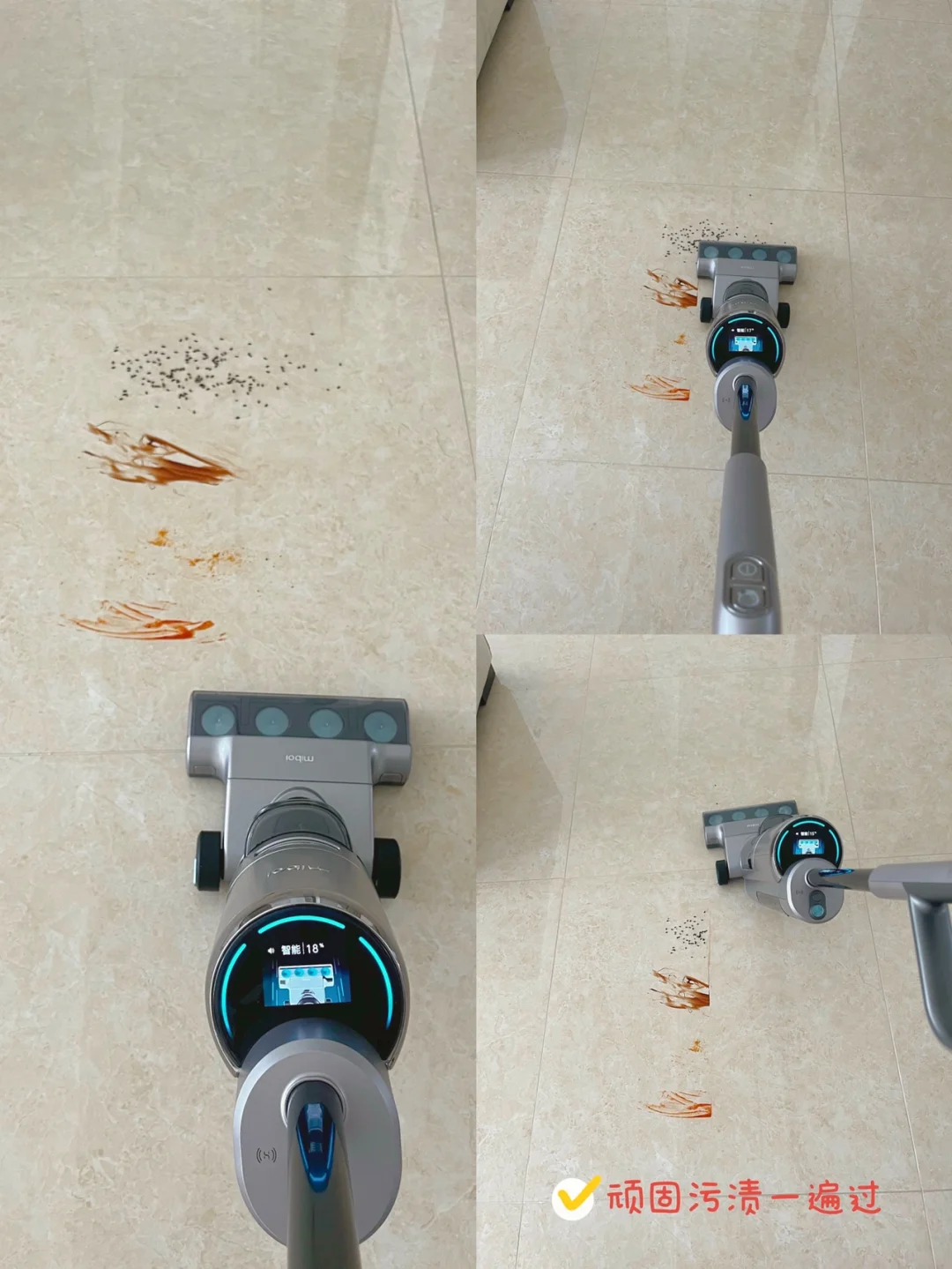 ✔️它的地刷是4个高速转动的小刮片,不同于拖地,米博的这款洗地机是直接把地面污渍快速“刮”下来,然后再通过大吸力把污渍吸走,清洁能力确实要强不少,我特意在地上到了点很难清理的巧克力酱,没想到一遍就能拖干净。