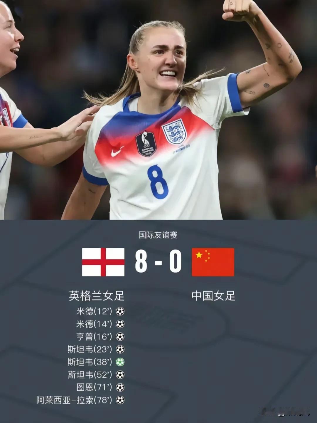 曾经我一直以为,铿锵玫瑰中国女足才是真正的中国国足,代表中国足球最高水平!没想到热身赛中国女足0:8惨败英格兰女足,换作中国男足踢英格兰男足,也不至于输8个球啊!这真的是中国足球史上的又一耻辱记录! 原来不是咱们的中国女足强,是人家欧美国家之前没推广重视,现在人家开始重视了,中国女足踢不过了!当这只是客观因素,主观因素还是球员水平没跟上,踢球的人太少了,关注度影响力在国内日益下降!没人愿意让自己的孩子走踢足球这条道路! 哎,这么看来,中国女足的成绩一步步下滑也能让人理解,毕竟曾经辉煌过!我也不站着说话不腰疼,面对现状只能说,祝福中国女足,早日走出困境,未来加油!