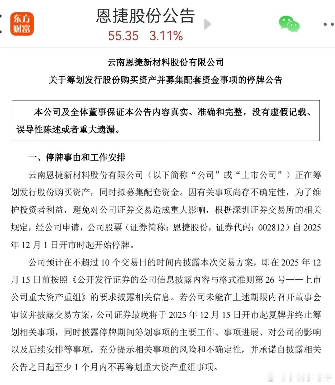 恩捷股份,停牌!“恩捷股份11月30日公告称,公司正在筹划发行股份购买资产,同时拟募集配套资金。因有关事项尚存不确定性,为了维护投资者利益,避免对公司证券交易造成重大影响,根据深圳证券交易所的相关规定,经公司申请,公司股票自2025年12月1日开市时起开始停牌!”“恩捷股份”怎么看上了“中科华联”?1、战略协同效应 — 1+1>2恩捷股份作为全球湿法隔膜龙头,中科华联作为核心装备制造商,二者的结合强化供应链控制力,提升成本与技术优势!2、强化核心能力——湿法隔膜整线解决方案中科华联的核心竞争力在于其专注于湿法锂离子电池隔膜整套生产装备的研发、制造与销售,这与恩捷股份作为全球湿法隔膜龙头的业务高度互补,收购将直接补强恩捷在产业链上游的设备制造能力,中科华联的技术能为恩捷股份带来直接的技术赋能!总之,恩捷股份此次筹划收购青岛中科华联,主要看中的是后者在湿法锂电池隔膜整线装备 领域的 核心生产能力 和 自主知识产权技术,能帮助恩捷进一步巩固其在湿法隔膜领域的龙头地位!