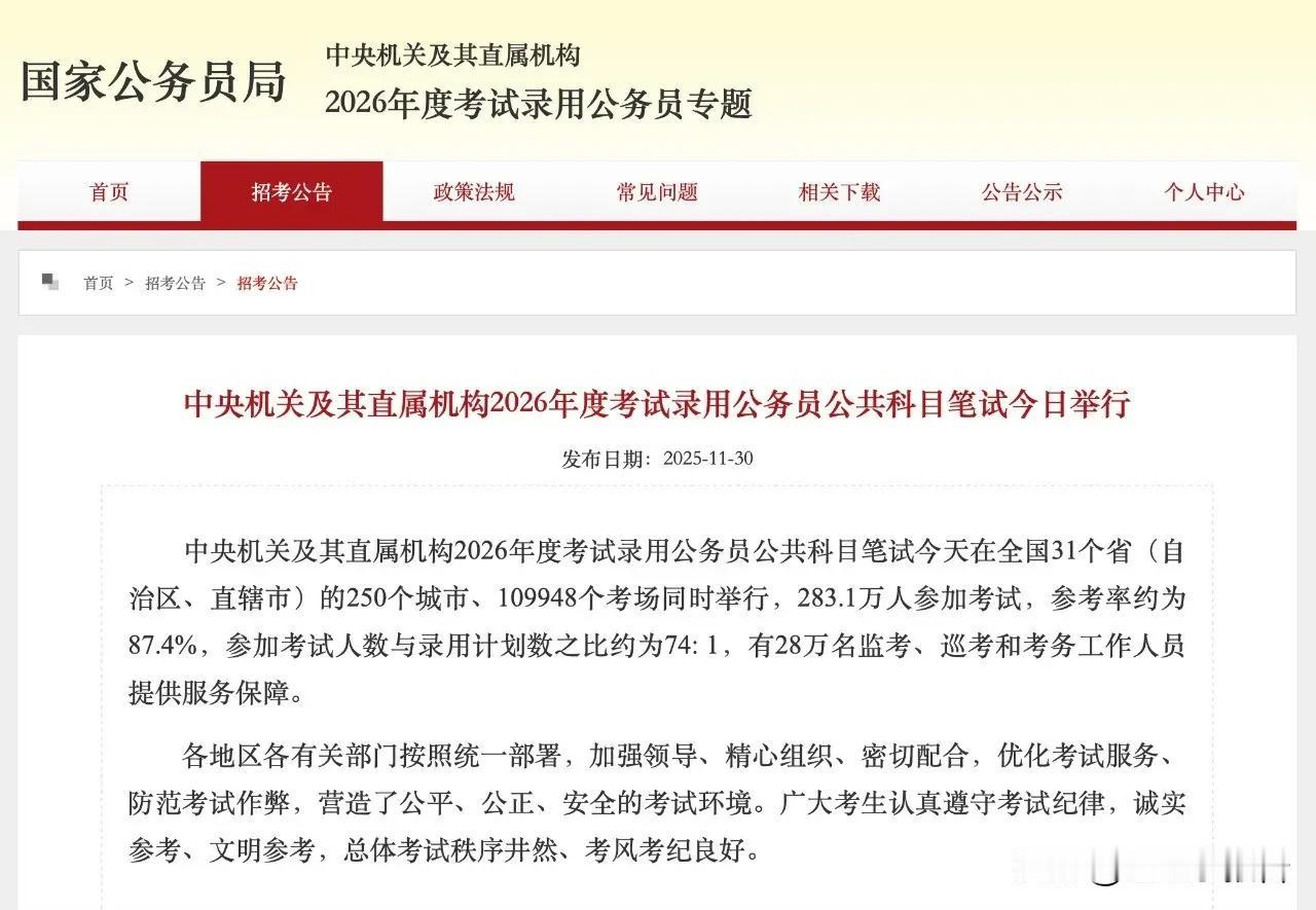 2025年国考今日笔试开考,根据公开数据,全国参加考试的考生有283.1万人,平均竞争岗位比例为74:1。 拿2024年高考数据来简单对比下,2024年江苏高考考生数量约47.7万人,而985高校在江苏录取人数约为7600人,录取比例大约在62:1。 也就是说,包括国家公务员的平均通过比例甚至低于高考生考上985的比例。而对于国考报名中的热点岗位,比如中华职业教育社一副主任科员及以下岗位的竞争比例竟然超过10000人竞争一个岗位。 这么看来,热门国考岗位的竞争比例高于高考生考上清华北大的比例,也就是说比考上清华还难。国考岗位竞争比 (图片引用自网络)