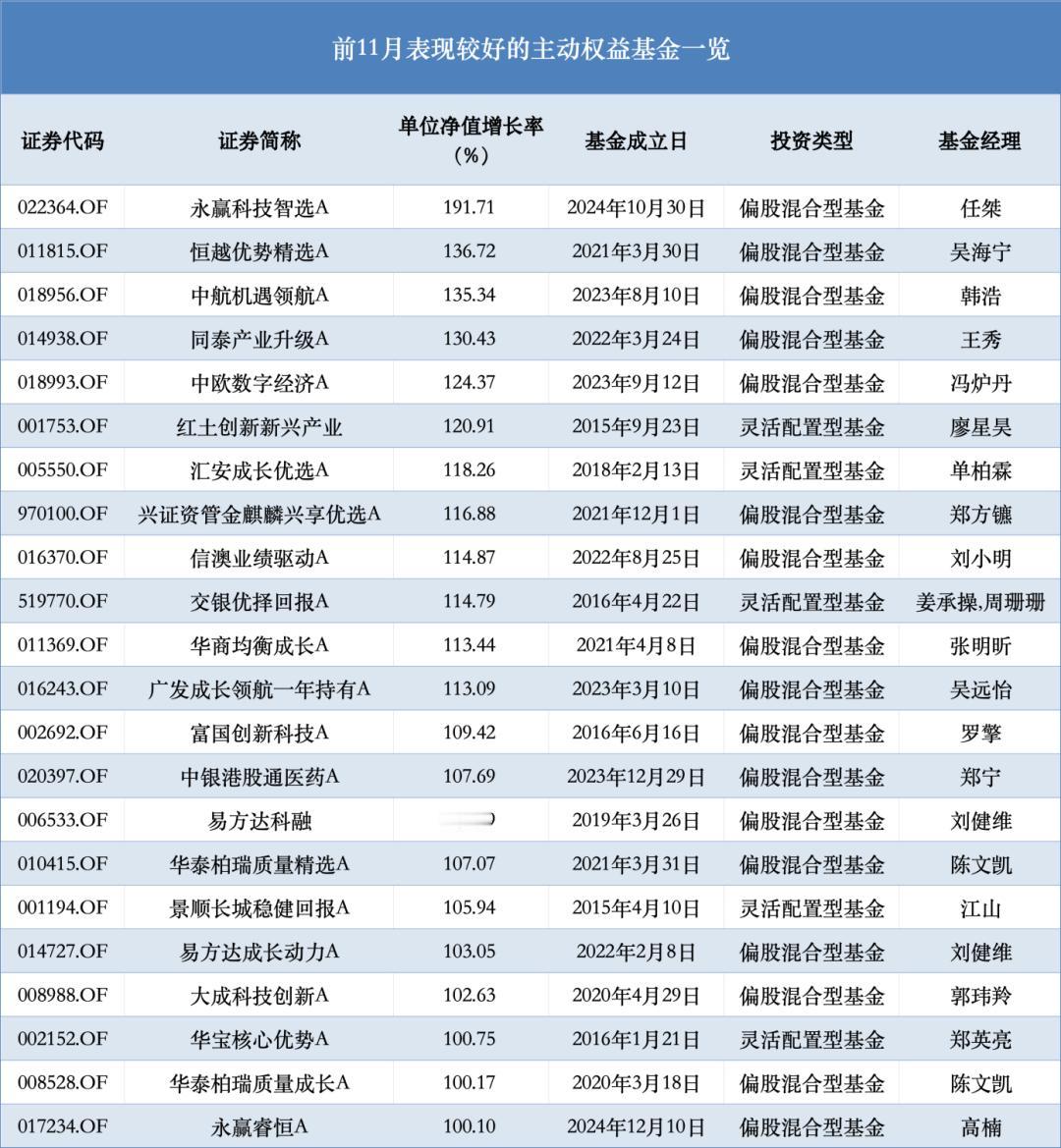 主动权益类基金的“翻倍基”批量出现。数据显示,截至11月30日,今年以来共有865只主动权益基金(剔除次新基金)单位净值增长率超过50%,38只超过100%,最牛基金单位净值增长率高达191%。