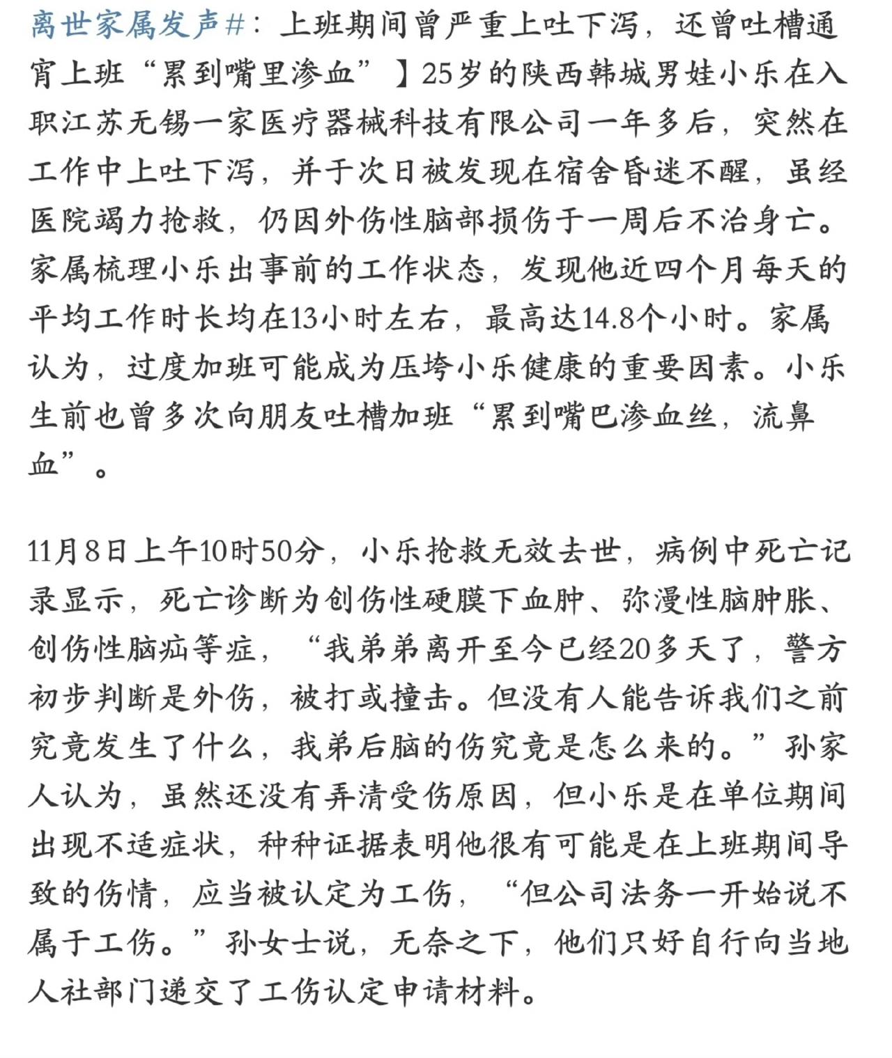 25岁小伙下班回宿舍离世家属发声 那个扶着墙呕吐的年轻人,最后还是没能回家。 二十五岁的小乐,在连续四个月每天工作十三小时后,倒下了。去世前那天,他在岗位上吐得直不起腰,仍被要求加班到深夜。第二天,同事在宿舍发现昏迷的他。送医九天后,这个年轻人永远合上了眼睛。 他的工作账号在他离去两小时后被标注“离职”。公司监控恰好在那些天“坏了”。尸检报告上写着“外伤性脑损伤”,可没人知道头是怎么伤的。警方只说有“外力”,企业先说不是工伤,后来才补交材料。 这一切,发生在月加班超过120小时之后——法律规定每月加班不得超过36小时。 这不是孤例。当法律还在争论“是否死在工作岗位”,生命已在加班记录里无声消逝。小乐生前常对朋友说累得嘴巴渗血丝,这些信号本该被听见。 医学证明,长期过劳会让血管变脆,免疫力下降。重度呕吐可能是肠胃炎,也可能是颅内高压——而疲劳会掩盖早期症状,延误救治。头部受伤后呕吐,必须立即做CT;腹泻到无法站立,急需紧急补液。这些常识,在“再坚持一下”的要求面前,都太容易忘记。 他的遭遇撕开了一个残酷现实:现行工伤认定仍困在“工作时间、工作地点、突发疾病”的条框里。过劳的伤害是累积的,却很难被法律看见。就像厦门的某个案例,员工在宿舍猝死,工伤申请两度被驳回。 我们需要的不仅是同情,更是改变:将“过劳累积损害”纳入工伤认定,让企业自证加班合理性,安装实时工时监测系统。 而对每个正在加班的人,请记住:降级消费总比透支生命强。当身体发出呕吐、站立不稳、异常出血的信号,请立即停止工作去就医。你的生命,比任何工作都珍贵。 小乐扶墙呕吐的身影,应该成为最后的警钟。在无数加班记录里,下一个身影不该再这样倒下
