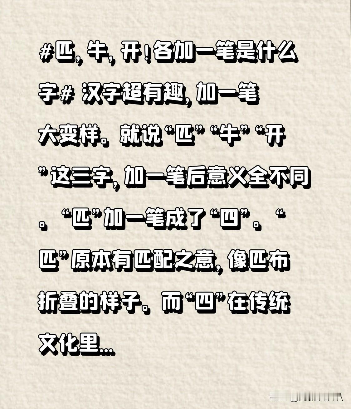 汉字超有趣,加一笔大变样。就说“匹”“牛”“开”这三字,加一笔后意义全不同。 “匹”加一笔成了“四”。“匹”原本有匹配之意,像匹布折叠的样子。而“四”在传统文化里代表四方、四季,一年的春夏秋冬,空间的东南西北,都离不开它。 “牛”加一笔变为“生”。牛勤劳踏实,是农耕好帮手。“生”代表生命、生长,春天小草破土而出,就是生命的奇迹,也寓意着生活与成长。 “开”加一笔暂时没想出合适的,不过这也体现了汉字变化的奇妙。汉字的魅力就藏在这一笔一划的变化中。