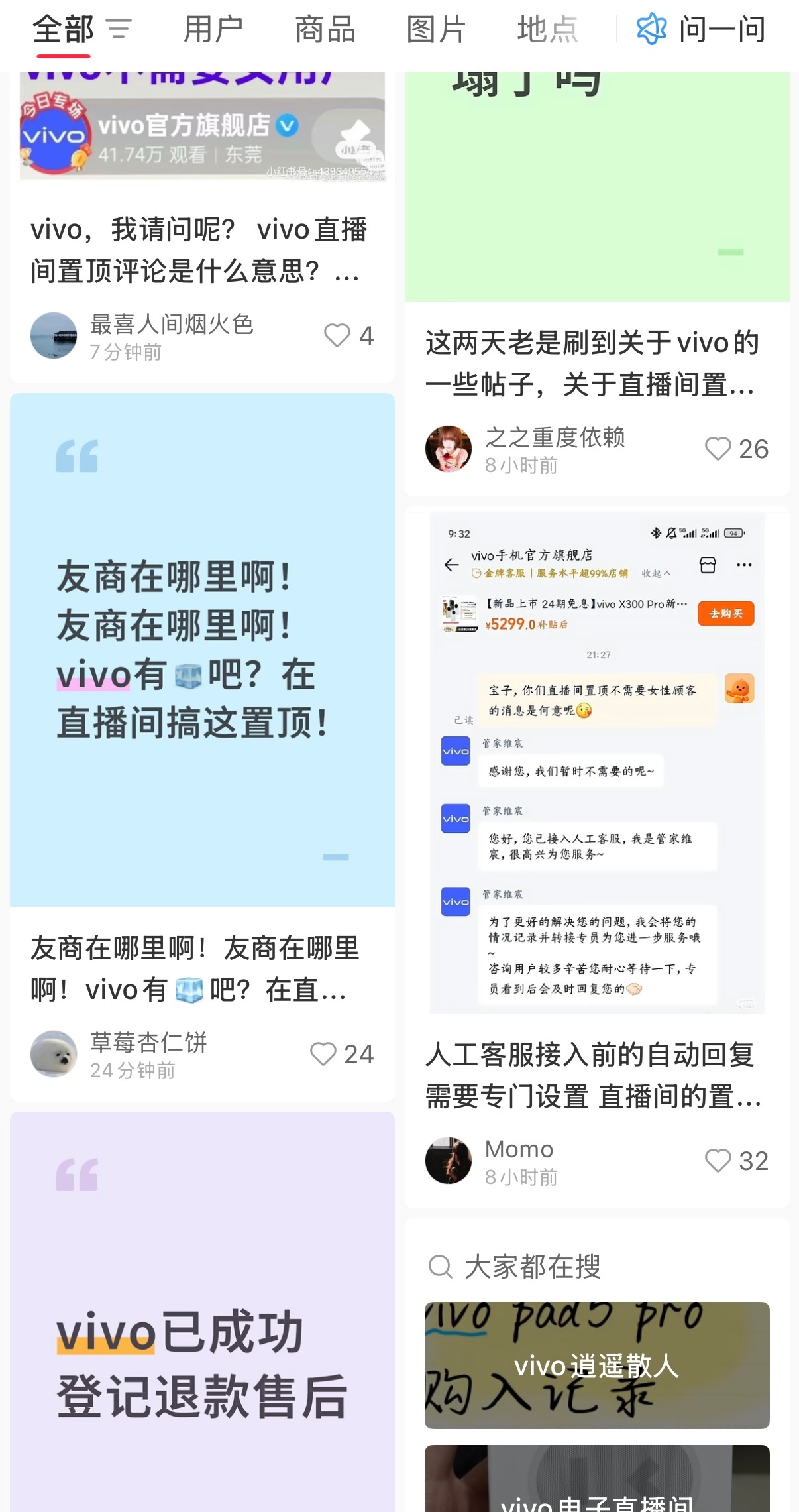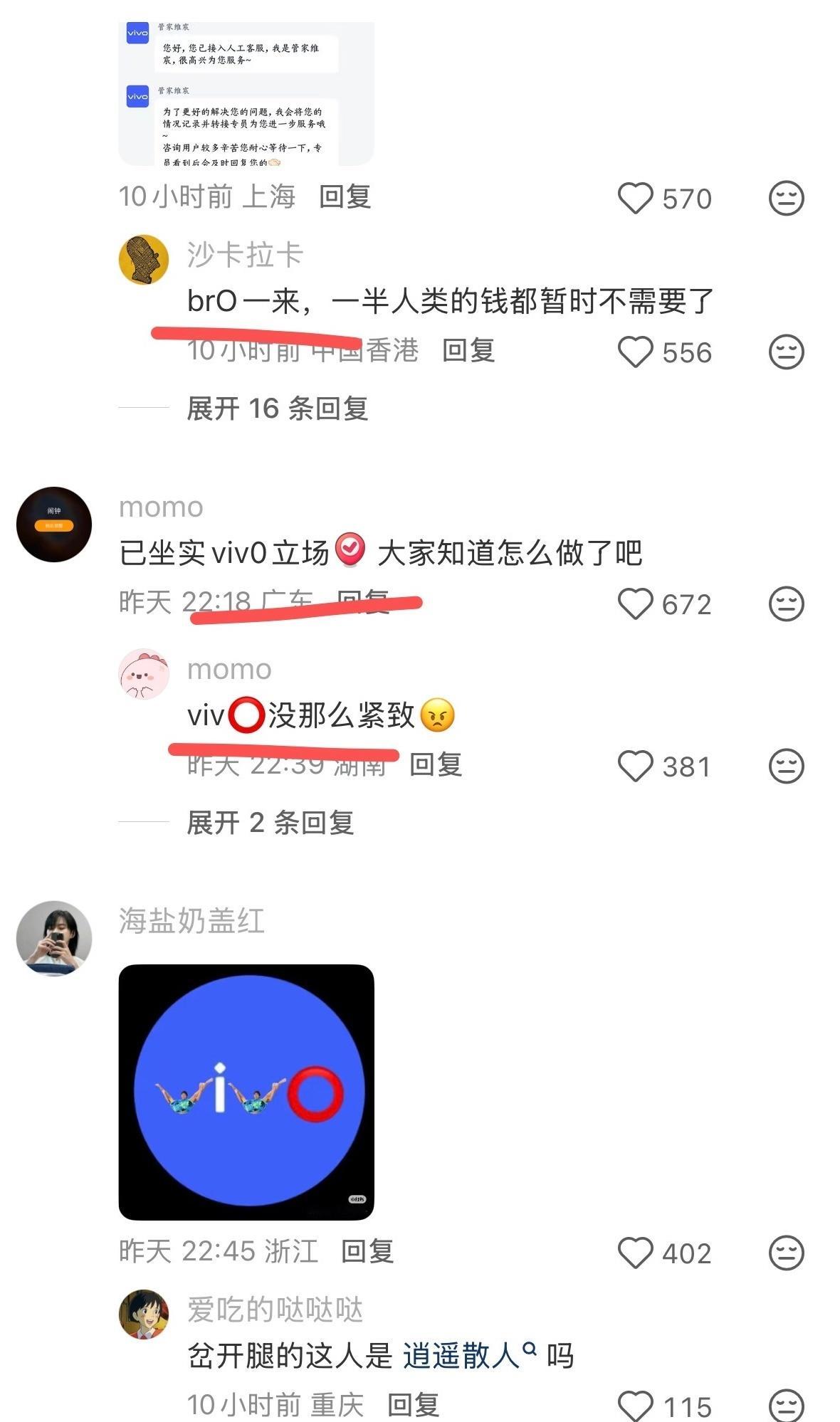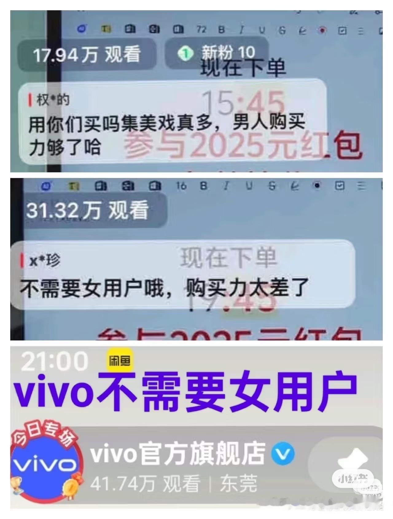 就最近因为某游戏主播的事情,我以为就米哈游有事,结果怎么还带上vivo了啊?我是真的没看懂,我只能说这些被牵连的品牌都无妄之灾…首先直播间的高亮评论,一般都是热门评论,被部分群体恶意带节奏,完全是自导自演…而且蓝厂这些年给女生研究自拍美颜这些下的功夫还少吗,还要被扣上这种帽子…现在某书上全是同质化的帖子,很难不觉得是被搞了。赶紧出动吧,看看到底是谁在搞事情我都看不下去老实人无端端被网bao了
