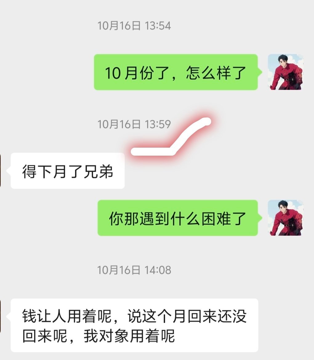兄弟们,7月的时候借钱给一个亲戚,一开始说9月还,结果整个9月没有消息,10月问,说11月还,今天月底再问,不回消息了......(不担心他不还,只是没想到又是这种一拖再拖,好借好还,再借不难嘛)
