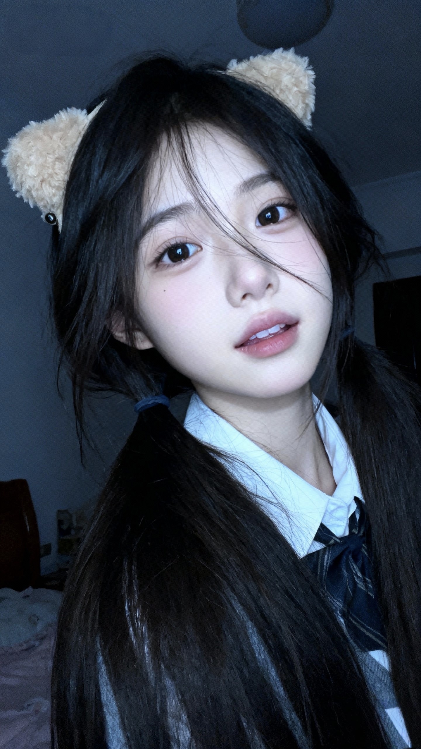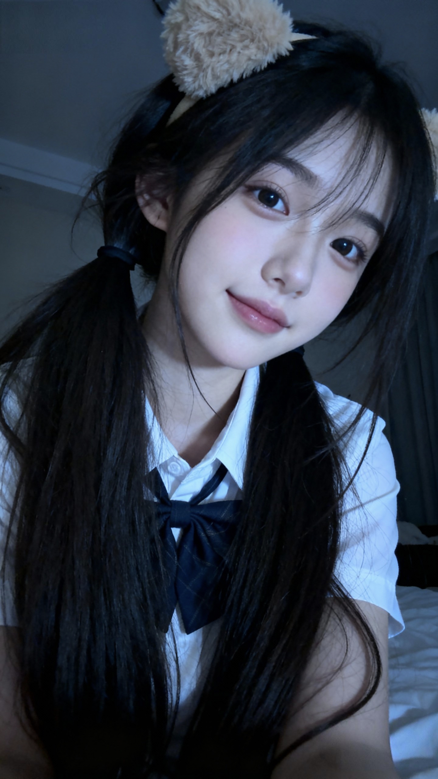 人物:18岁左右冷白皮少女,戴着毛绒发卡,穿着校园女神温柔装,黑长直深色长发系带束缚,年轻娇小,发丝自然蓬松垂坠,散落肩头两侧,几缕发丝拂面,表情可爱。
