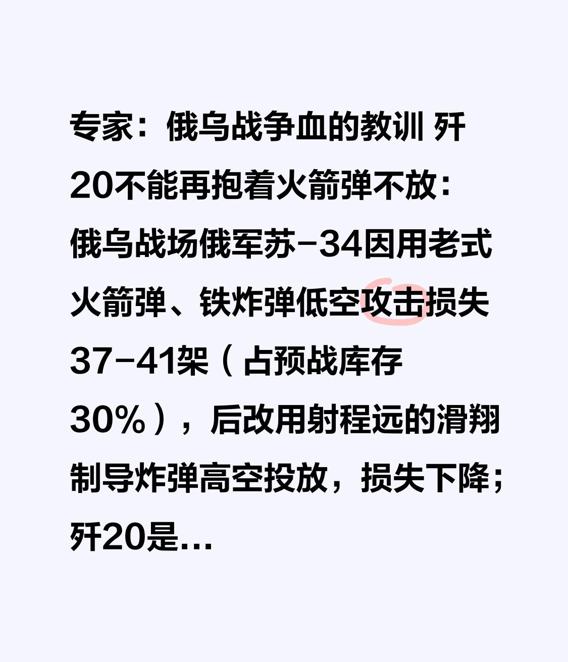 专家:俄乌战争血的教训 歼20不能再抱着火箭弹不放:俄乌战场俄军苏-34因用老式火箭弹、铁炸弹低空攻击损失37-41架(占预战库存30%),后改用射程远的滑翔制导炸弹高空投放,损失下降;歼20是五代隐身机,挂外部火箭弹会失隐身优势,应走超视距、远程精确打击和体系化作战的正道。