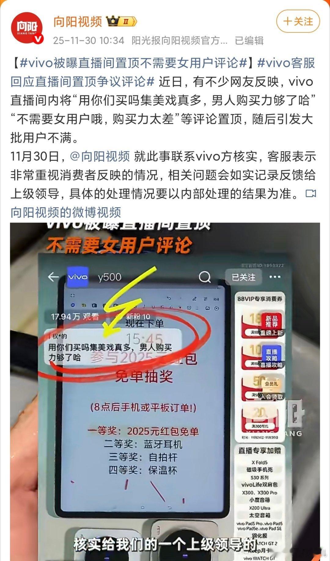 vivo被曝直播间置顶不需要女用户评论看过直播的应该都知道,这个不是主播在直播间发的,是评论区的网友的评论,出现这种评论估计vivo最近得罪啥人了,被集中搞一波,话说vivo手机主打就是颜值和拍照,主力用户群体就是女性,而且女性的购买力要高得多,怎么可能得罪女生,很明显是有人带节奏,大家还是擦亮眼睛明辨是非。