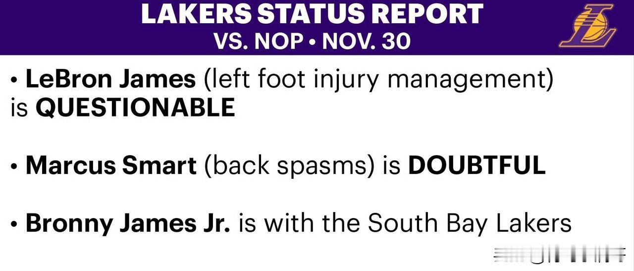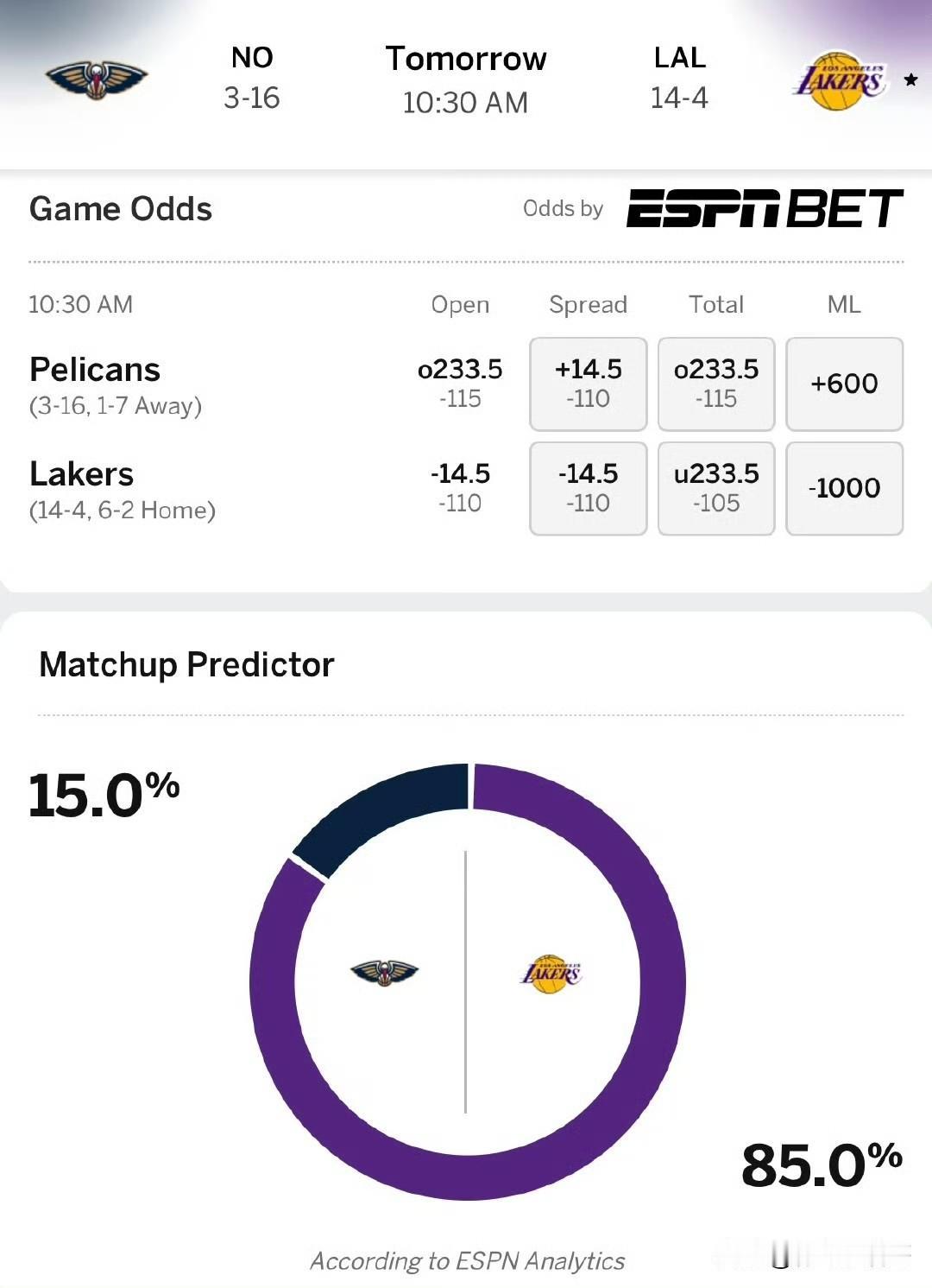 鹈鹕vs湖人比赛预告!!!鹈鹕对阵湖人比赛预测,湖人被看好! 北京时间12月1号,星期一,25年最后的一个月开始了,湖人在12月第一天就有比赛,而且是主场迎战弱旅鹈鹕,一起来看一下比赛的预告吧。 湖人伤病方面,詹姆斯出战成疑,斯玛特还是大概率不会打,而布朗尼已经被下放发展联盟了。 鹈鹕方面,墨菲、普尔、穆雷等主力继续缺阵。 目前ESPN给出的比赛预测结果中可以看出,湖人以超过八成的概率被完全看好,而且鹈鹕是背靠背比赛,湖人是不是很轻松咯,湖人主场也是给出了-14.5。 詹姆斯预计还是会打的,不过打鹈鹕也不需要他过多的发挥,轻松享受一下就行了,为后面比赛节省体力。 湖人 nba 湖人 湖人赛程 湖人比赛 湖人队赛程分析