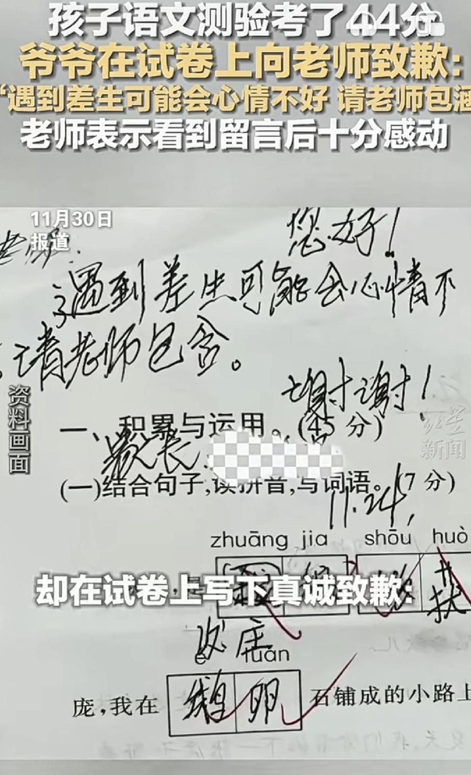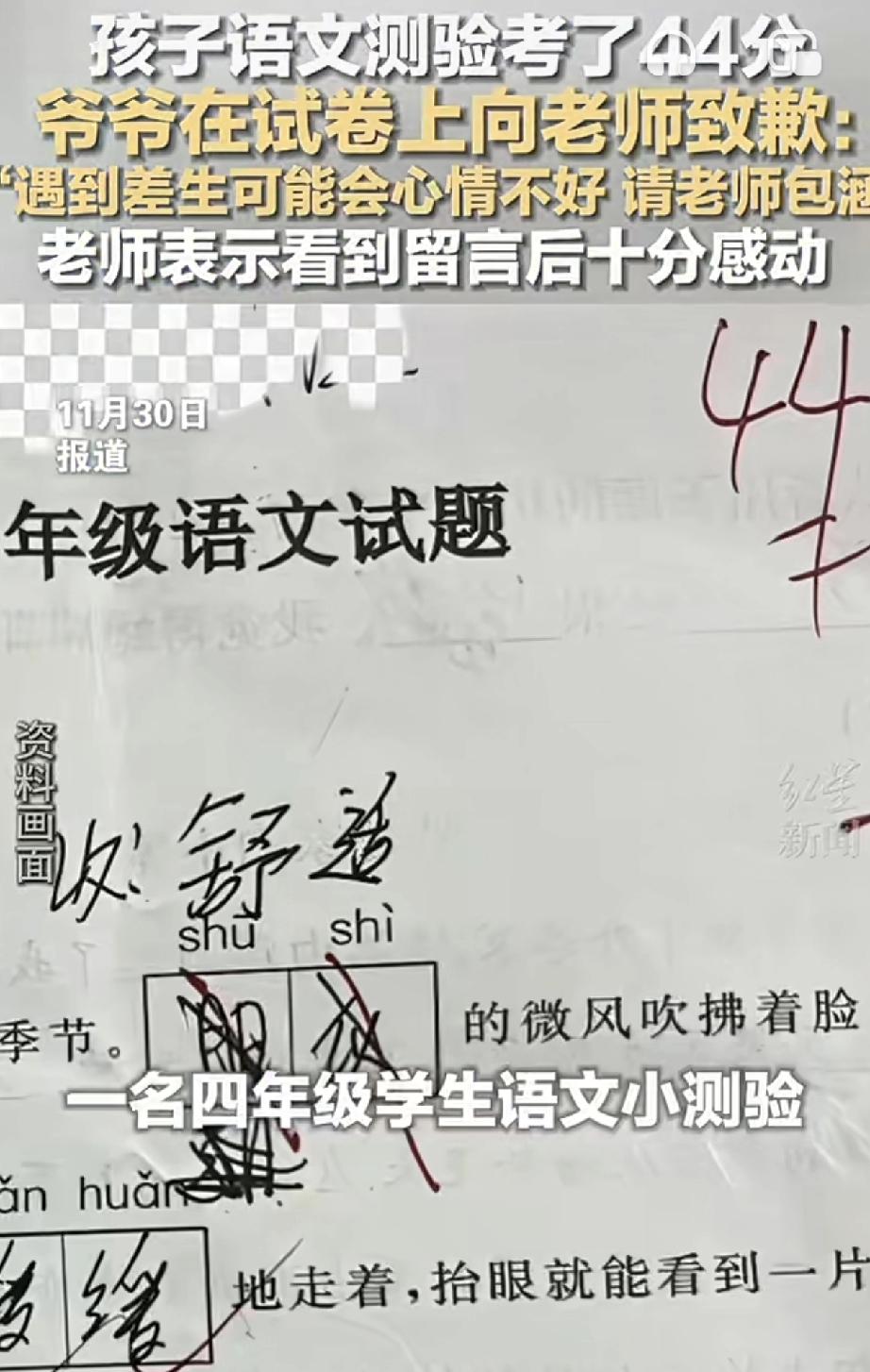湖北襄阳, 一名四年级孩子,在一次语文小测试中只考了44分,本来糟糕的分数让老师也觉得有些生气,但孩子将试卷拿回家后,孩子爷爷在试卷中的真诚致歉,却让老师十分感动。原来,爷爷阅卷后,便在试卷左上角致歉留言道:老师您好,遇到差生可能会心情不好,请老师包涵,谢谢… 原来,这名孩子的父母常年在外务工,平日里都是由爷爷奶奶照顾,而他的成绩也暂时处于下游,还略显调皮。本来孩子的成绩也让老师觉得懊恼,可看其爷爷这一段朴实的留言,让老师感到十分感动,因为在成绩之外,这份善良也让其觉得非常暖心。 对此有网友就表示:爷爷不但字写得好,这书写格式也好严谨,看来爷爷平日里是个讲究人,所以孩子可能学习差点,但人品一定不差。 还有网友表示:家长不容易啊!这爷爷也不容易!只可惜上了年纪力不从心,不然孩子成绩应该不会太差,希望老师也能体谅这样的孩子… 更有网友表示:作为老师我真的会很感动,因为一个能体谅老师的家长真的很难得,泪目了,我觉得做老师真的需要很大的勇气。 不得不说,爷爷这段真挚的留言,充分体现了这位长辈对老师的体谅与真诚,而这份体谅与真诚,又何尝不是教育里最暖心的瞬间呢?正如老师所说,孩子的成绩暂时处于下游,相信以后老师冲着这份真诚,也会拉孩子一把! 最后希望,老师和家长之间,都像这样能互相理解真诚以待,共同把孩子教育成才!