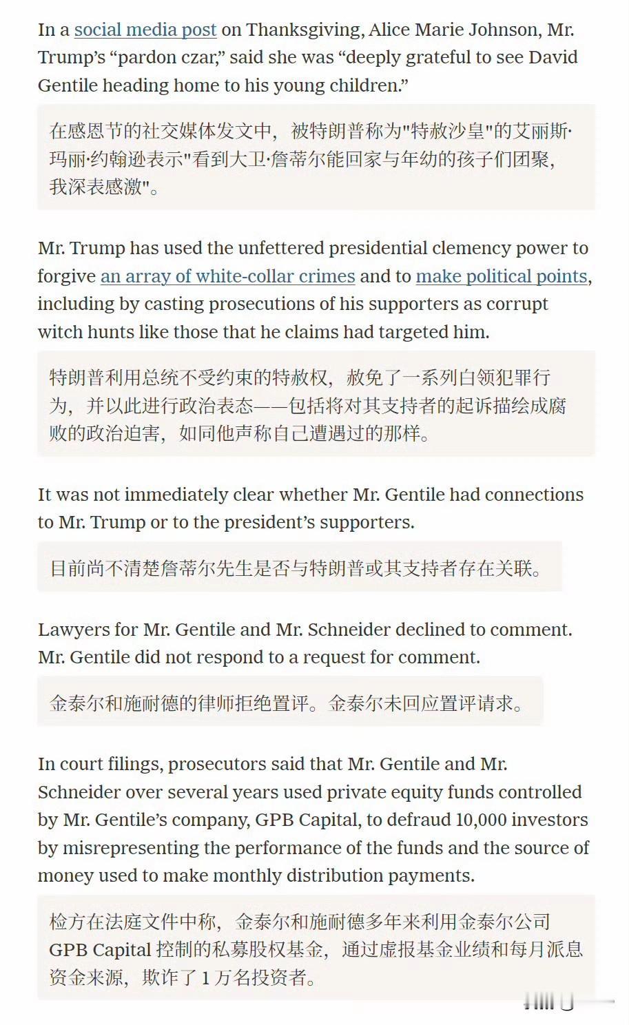 纽约时报独家消息:大卫·詹蒂莱于 11 月 14 日入狱服刑,检察官指控其涉案金额达 16 亿美元的诈骗计划导致数千名受害者受骗,被判 7 年监禁。特朗普 12 天后对詹蒂莱签署特赦令,使其获释出狱。
