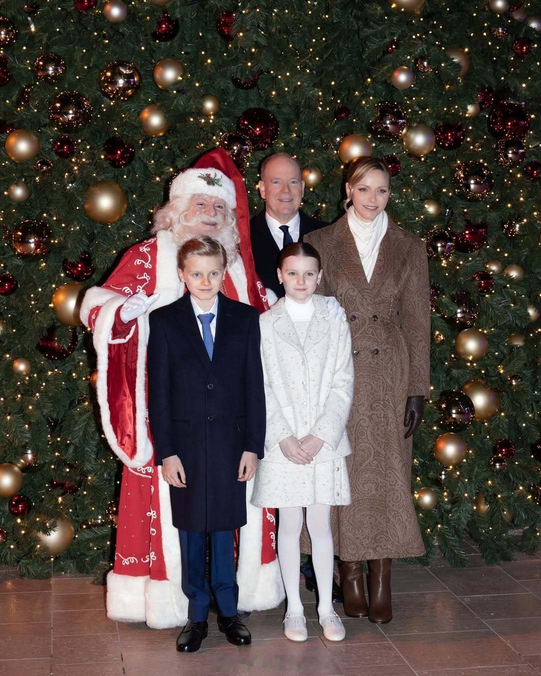 11.19 摩纳哥亲王阿尔贝二世、王妃夏琳和龙凤胎出席赌场广场的圣诞亮灯活动,夏琳大衣来自etro