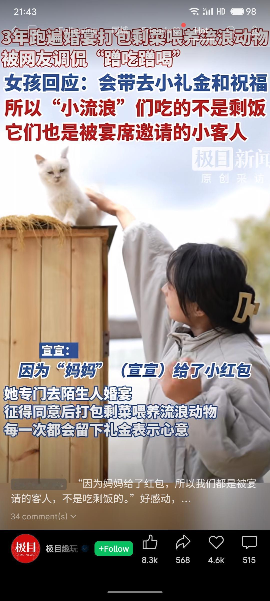 云南95后女孩宣宣三年间奔走于各大婚宴,在征得新人同意后打包剩菜,用于喂养自己救助的126只流浪动物。她每次都会奉上吉祥数字的红包作为礼金,并暖心表示:小动物们“也是被宴席邀请的客人”。这一善举巧妙地将节约粮食与关爱生命相结合,展现了温暖的公益情怀。