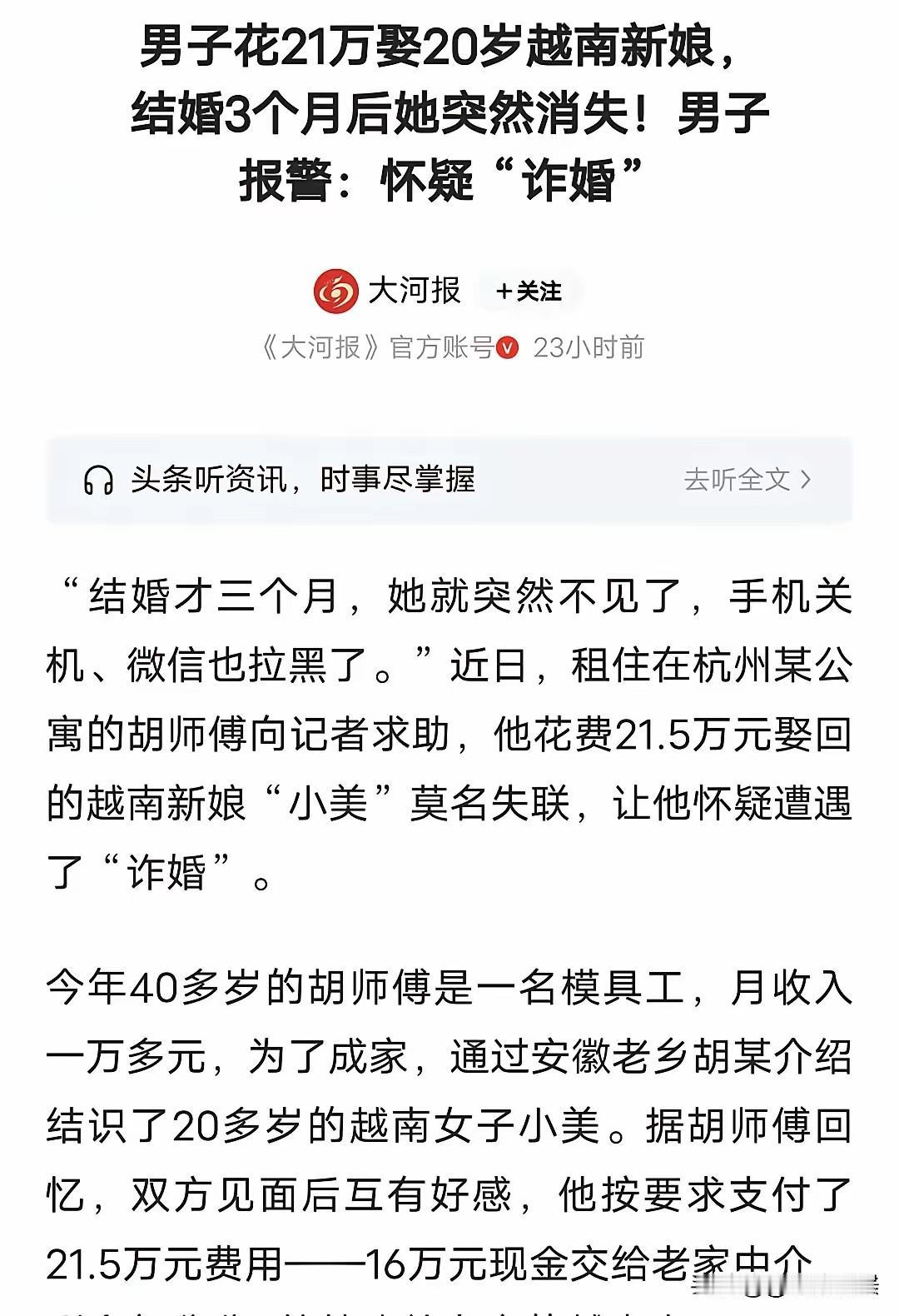 浙江杭州,40岁多男子花21万,娶了一20岁的越南新娘,婚后,他发现妻子一直在吃避孕药,妻子解释说是调解月经,3个月后,妻子突然不见了,男子怀疑:妻子护照在自己手里,她语言不通,没有熟人怎么出远门?怀疑自己被“诈婚”了! 浙江杭州的陈先生今年四十出头,常年在工地做技术工作,收入稳定却一直没遇到合适的伴侣,看着身边人陆续成家,他也越发着急,经身边工友介绍,认识了专门对接跨国婚恋的介绍人,对方称能帮他找到踏实过日子的越南姑娘,各项流程稳妥靠谱。 陈先生抱着期待和介绍人对接,前后沟通了一个多月,对方陆续发来几位越南女子的照片和基本情况,其中一位二十岁的姑娘让他动了心,介绍人说姑娘性格温顺、会做家务,愿意踏实留在中国生活,只是需要支付21万的介绍费、彩礼以及各类手续费用,陈先生没多犹豫,当场敲定了这门婚事。 后续的见面和登记流程比陈先生预想的顺利,姑娘如约来到杭州,两人按流程办理了婚姻登记,介绍人特意出具了一份简单的书面说明,称会负责后续手续的跟进,确保姑娘的居留合规。 婚后陈先生对妻子十分上心,主动承担了家里大部分开销,平时上班前会提前备好食材,下班回家也会帮着分担家务,怕妻子语言不通孤单,还特意下载了翻译软件,一有空就教她简单的中文。 家里的现金和常用物品都放在妻子方便拿到的地方,满心期待着能安稳过日子,甚至盘算着过段时间攒够钱就换个大点的房子,早点生个孩子凑成完整的家。 婚后半个月左右,陈先生偶然在卧室抽屉里发现了一瓶陌生的药片,包装全是外文,他借着翻译软件查询,才知道是口服避孕药,心里顿时泛起疑惑,明明两人没提过避孕的事,妻子怎么会私下吃这种药。 他拿着药片问妻子,对方通过翻译软件解释,说是自己月经不规律,在越南时就一直吃这种药调理,到了中国也没敢断,怕身体出问题。 陈先生虽然心里还有些疑虑,但看着妻子一脸真诚的样子,又想着异国他乡她可能确实需要调理身体,便没再多问,只是默默记下了药名,想着之后带她去医院做个检查,看看有没有更合适的调理方式。 接下来的两个多月里,两人相处得还算平和,妻子学着做中国菜,虽然口味清淡,但每顿饭都会提前做好等着陈先生回家,家里也被打理得干净整洁,陈先生渐渐放下了之前的顾虑,越发觉得自己选对了人,对未来的生活也更有盼头。 只是妻子偶尔会对着手机和人发消息,每次他走近就会快速收起手机,说是和家里人联系,陈先生想着她挂念家人也正常,从未过多追问。 期间他曾提议带妻子去医院检查身体,换调理月经的药,妻子却总以不习惯中国医院、怕麻烦为由推脱,每次都不了了之,他也只能顺着妻子的意愿,没再坚持。 婚后第三个月的一天,陈先生下班回家推开门,却发现家里空荡荡的,妻子不在家,平时常穿的衣服、常用的包都不见了踪影,他心里一慌,赶紧在屋里四处寻找,翻遍了每个房间都没看到妻子的身影。 翻译软件、之前常用的水杯也跟着消失了,只有餐桌上还放着前一天晚上妻子做的两道菜,盛菜的盘子没盖,已经长出了一层薄薄的霉斑。 陈先生瞬间慌了神,拿着手机一遍遍拨打妻子的电话,始终提示无法接通,联系越南那边的家人也没得到任何回应,他坐在空荡荡的屋里,脑子里一片空白,心里的委屈和慌乱涌上来,整整一个星期都没缓过神。 缓过神后,陈先生第一时间联系了当初的介绍人,想问问妻子的去向,可对方的态度却来了个一百八十度大转弯,说两人婚后的相处全看自身,是陈先生没照顾好妻子,才让她选择离开,责任全在陈先生身上,和介绍方没有任何关系,之前支付的费用也不可能退还,甚至说陈先生要是继续纠缠,就不再负责后续的任何手续对接。 这番话让陈先生又气又急,他仔细回想整件事,越想越觉得不对劲,妻子的护照一直由他妥善保管,登记时相关部门也核对过证件信息,确认是合法有效的,她中文说得不好,在杭州除了自己和介绍人,根本不认识其他人,怎么能悄无声息地离开,连一点消息都没留下。 带着满心的怀疑,陈先生到辖区派出所报了案,民警接警后展开调查,调取了小区及周边的监控,发现失联当天下午,有一名陌生男子曾在小区门口和陈先生的妻子碰面,两人随后一起乘坐一辆网约车离开,去向不明。 民警表示,从目前掌握的情况来看,陈先生遭遇跨国诈婚的可能性很大,这类案件中,介绍方往往和外籍女子串通,借助婚恋名义骗取费用,待拿到钱后便伺机失联,部分女子会借助同伙的帮助离开,即便护照被保管,也可能通过非法渠道办理临时证件或借助他人身份出行。 对此,你们有什么看法,欢迎评论留言~