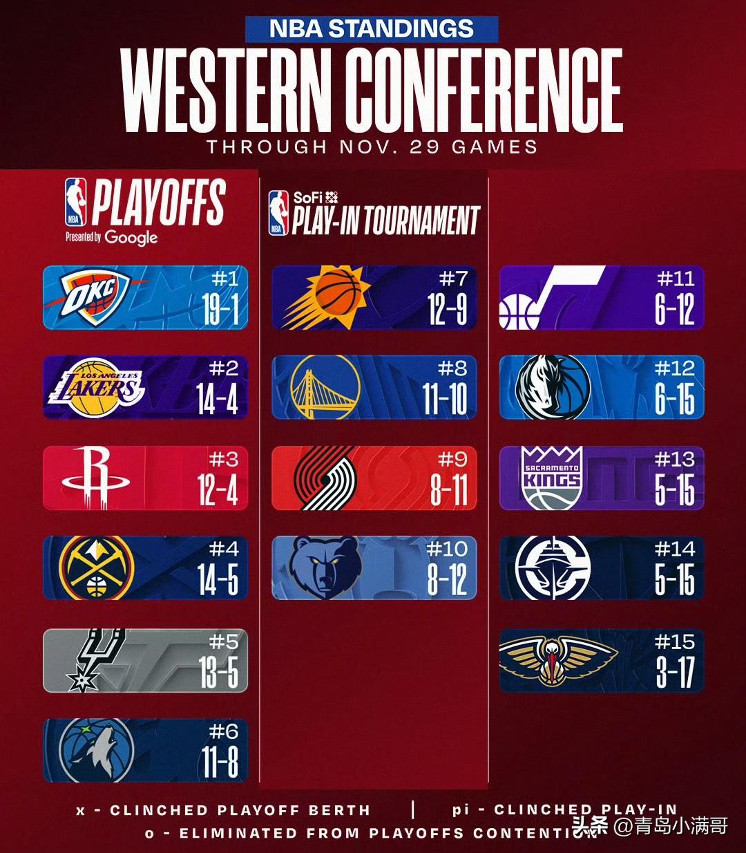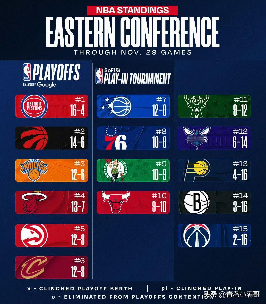 东西部最新排名!!!猛龙连胜被终结,勇士第八,快船倒数第二! 北京时间11月30日,11月的最后一天,比赛全部结束了,一起来看下球队最新的排名吧。 东部方面: 活塞战胜热火,活塞继续领跑东部,热火降至第四,猛龙不敌黄蜂稳居第二,凯尔特人输球排名第九,雄鹿赢球排名第十一,公牛输球排名第十。 西部方面: 勇士胜鹈鹕排名第八,掘金胜太阳排名第四,太阳第七,独行侠战胜快船排名第十二,快船倒数第二。 步行者今天战胜了公牛,步行者拿到赛季第四胜,他们超越篮网成为率先拿到第四胜的球队。 猛龙连胜被终结,活塞险胜,这让他们暂时稳住了第一的位置。 快船继续输球,他们现在已经真正的成了破船,修船的人去哪了呢? NBA实力榜 西部nba排名 nba最终排名 快船