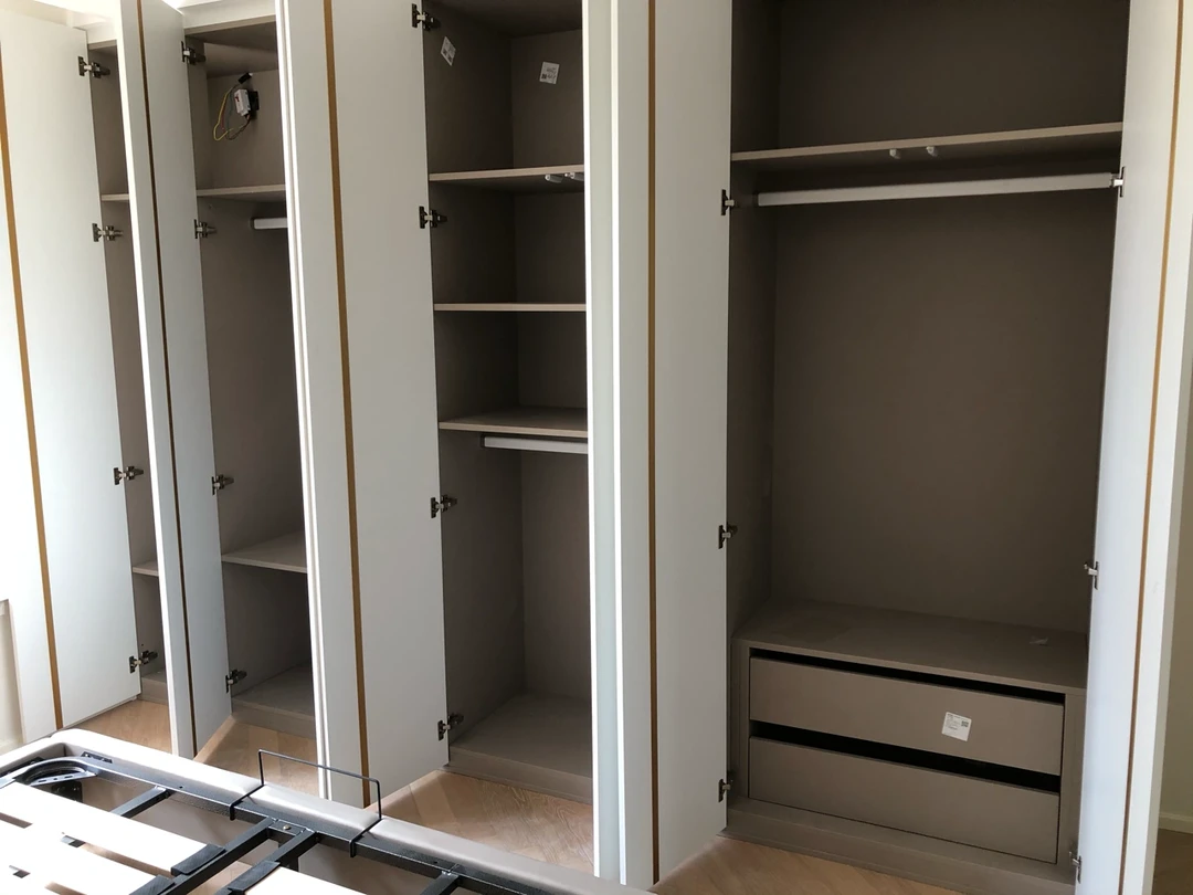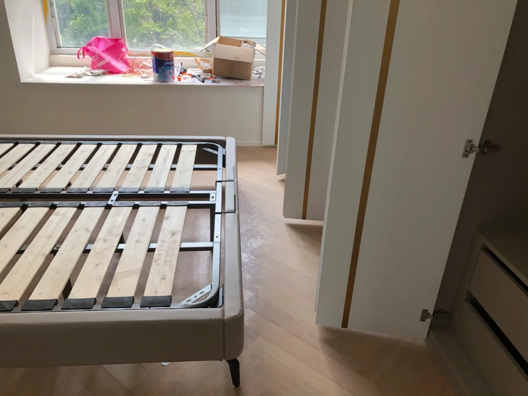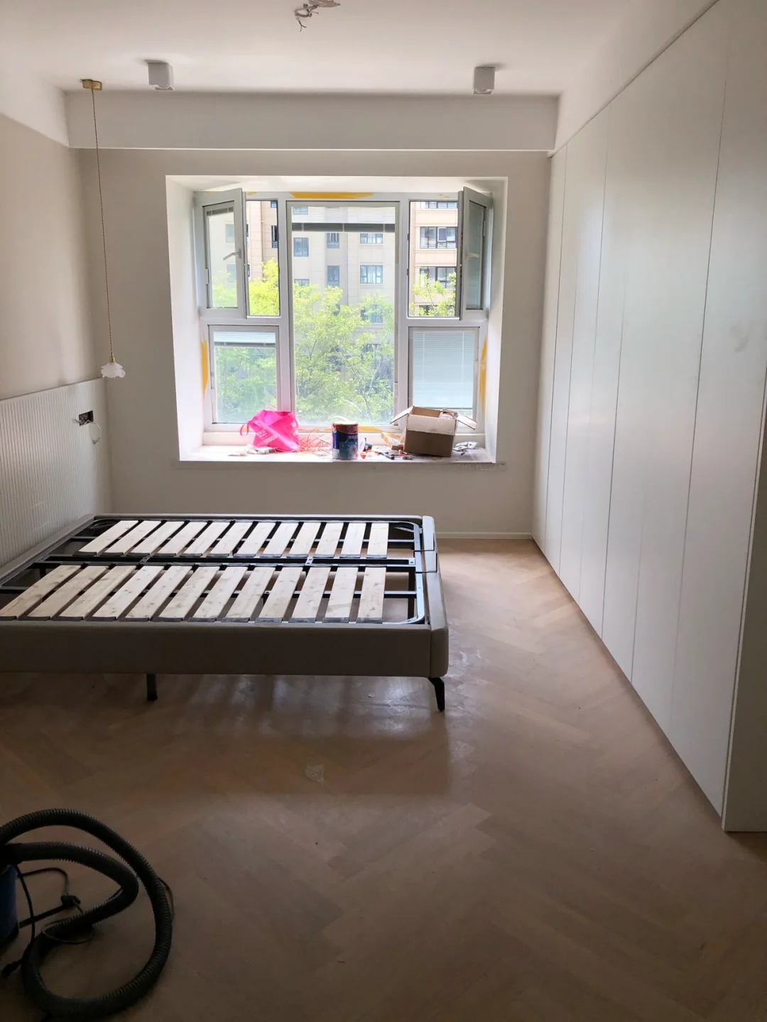 昨天🍑上买的没有床头的床到了,迫不及待联系师傅安装完了,床摆进去以后主卧空间依然很开阔👍 ✨大家关心的床尾和衣柜的距离现在是74cm,主卧整体宽度是3.36m 74cm走人完全没有压力,甚至柜门整体打开空间也不会拥挤🌞 🌟tips:打算做床尾柜的亲们,在柜子设计时注意将抽屉设计在最外侧的柜子里,这样方便蹲下拿取衣物[萌萌哒R]