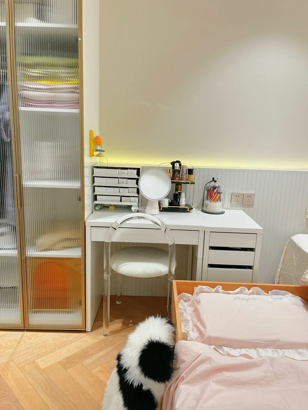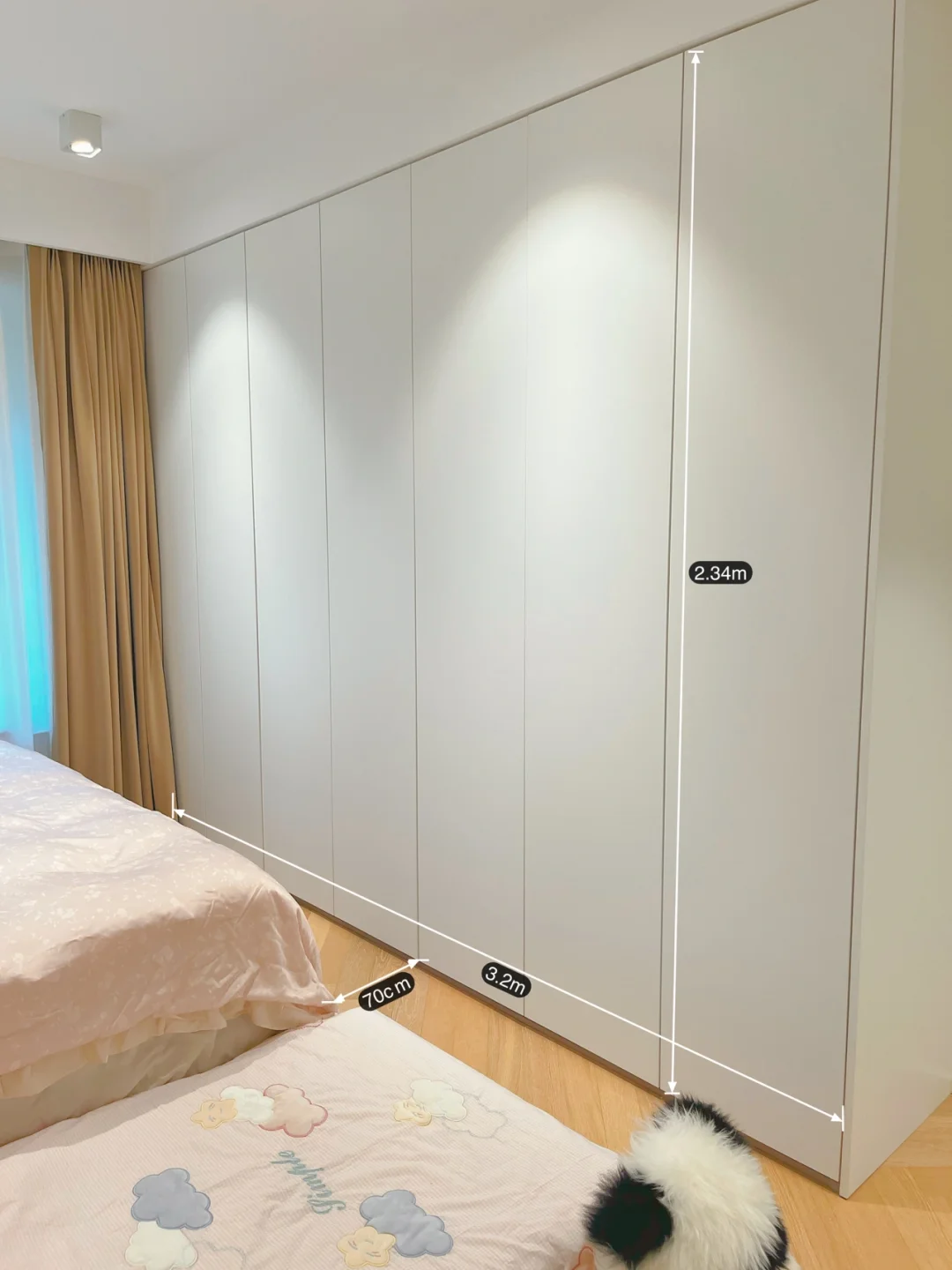 👉这里给想要做床尾柜的姐妹们一点参考,一般衣柜深度55cm、床的长度2米,如果加上床头一般是2.2米左右,所以如果你家卧室宽度超过3.3米就完全没问题。