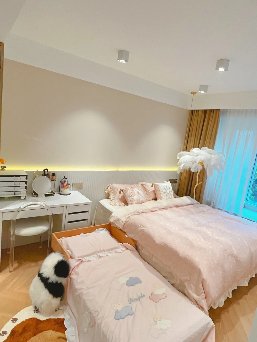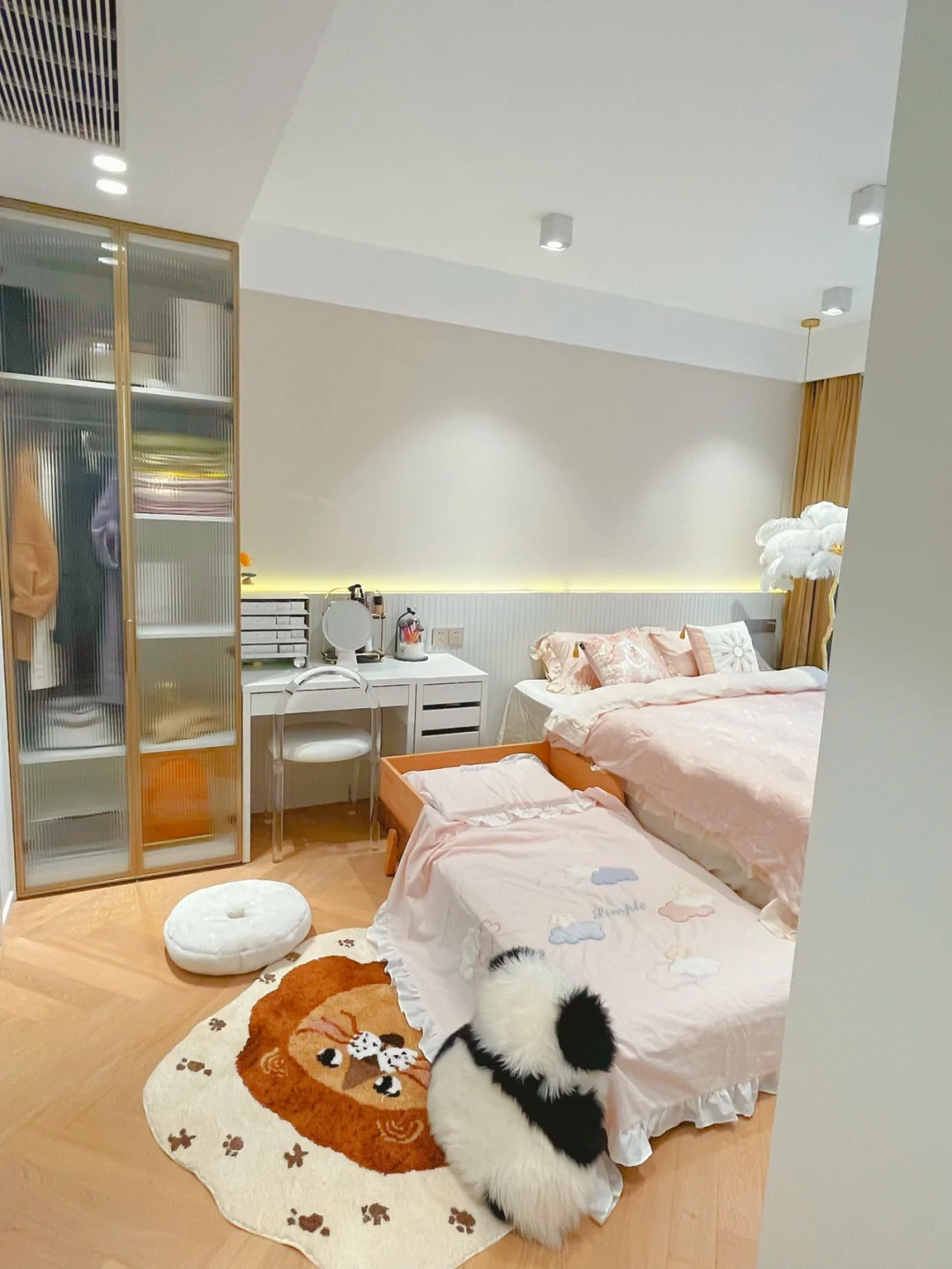 🟠做了床尾柜才发现床尾柜真的太实用啦!除了可以让卧室更开阔通透,最主要床边空间很大,我家直接放了个小小的儿童床,娃目前两岁多,平时在大床上担心她会滚下去,我们也睡不好,现在添置的这个小床放旁边,她也喜欢。儿童床是实木的,尺寸不大,应该也够她睡到小学了吧!