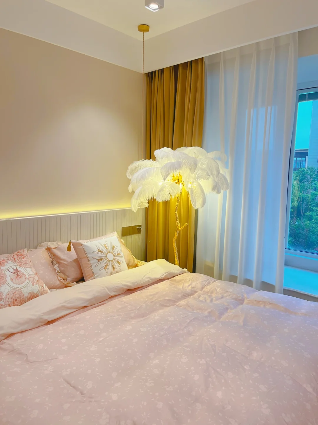 床头的羽毛灯也太仙了,灯光一开整个卧室都变得温柔啦!