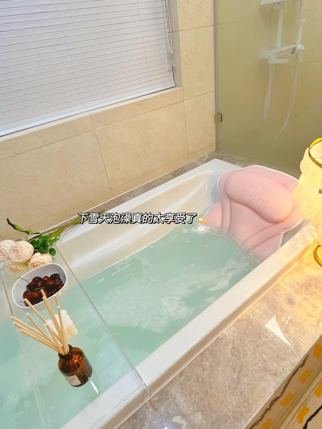 这两天下❄️了,晚上等娃睡着后浴缸里泡个澡真的太享受了~放上海盐浴球,今晚选择的是茉莉香型,枕着浴缸枕,闭上眼睛,让身心彻底地放松下来