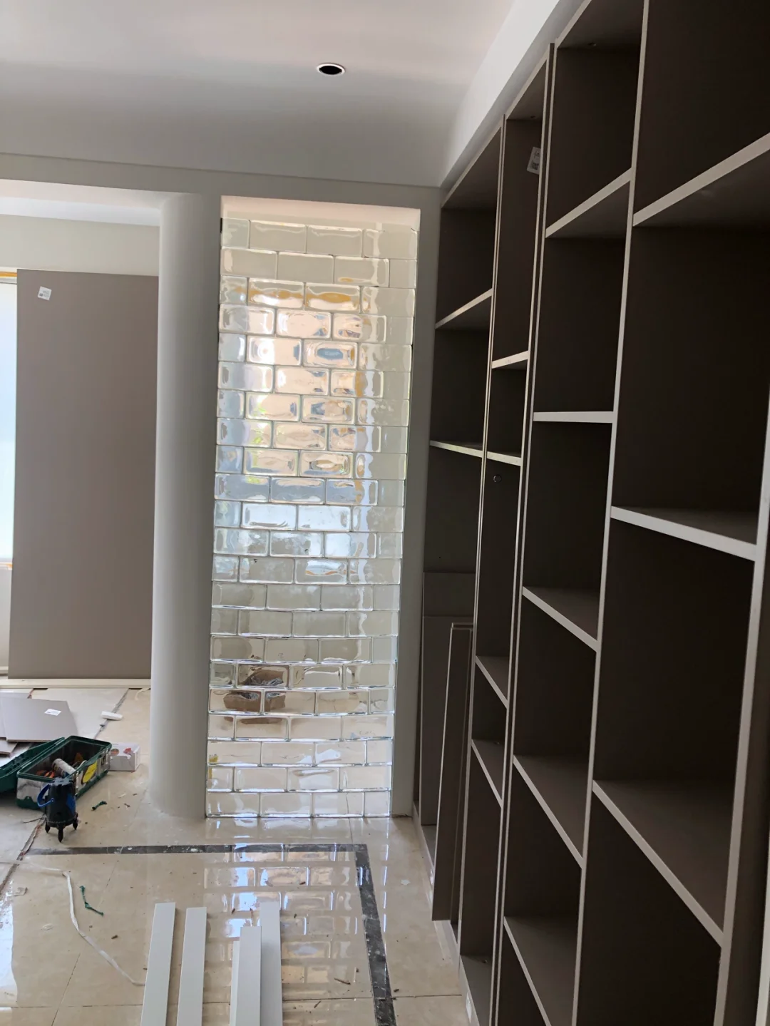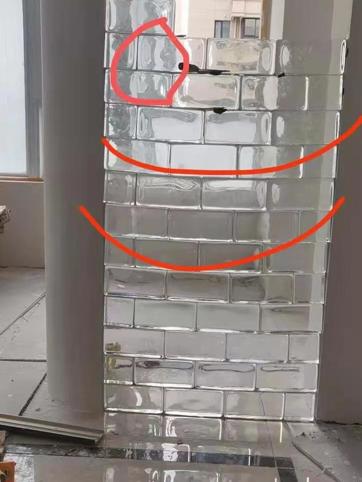 玻璃砖基本砌好了,但是仔细看中间是弯的,见图3⃣️,而且一开始深零砌的时候连水平线都不愿意打😤项目经理敷衍的态度真的让我很😡😡 最后砌完是图1⃣️图2⃣️,😭强迫症的我每次来家里看到这个歪歪扭扭的玻璃砖都有拆了重新砌的想法,下周打算等家里定制柜子装完以后自己找人重新砌[暗中观察R]装修日常 合肥装修|精装房改造|玻璃砖