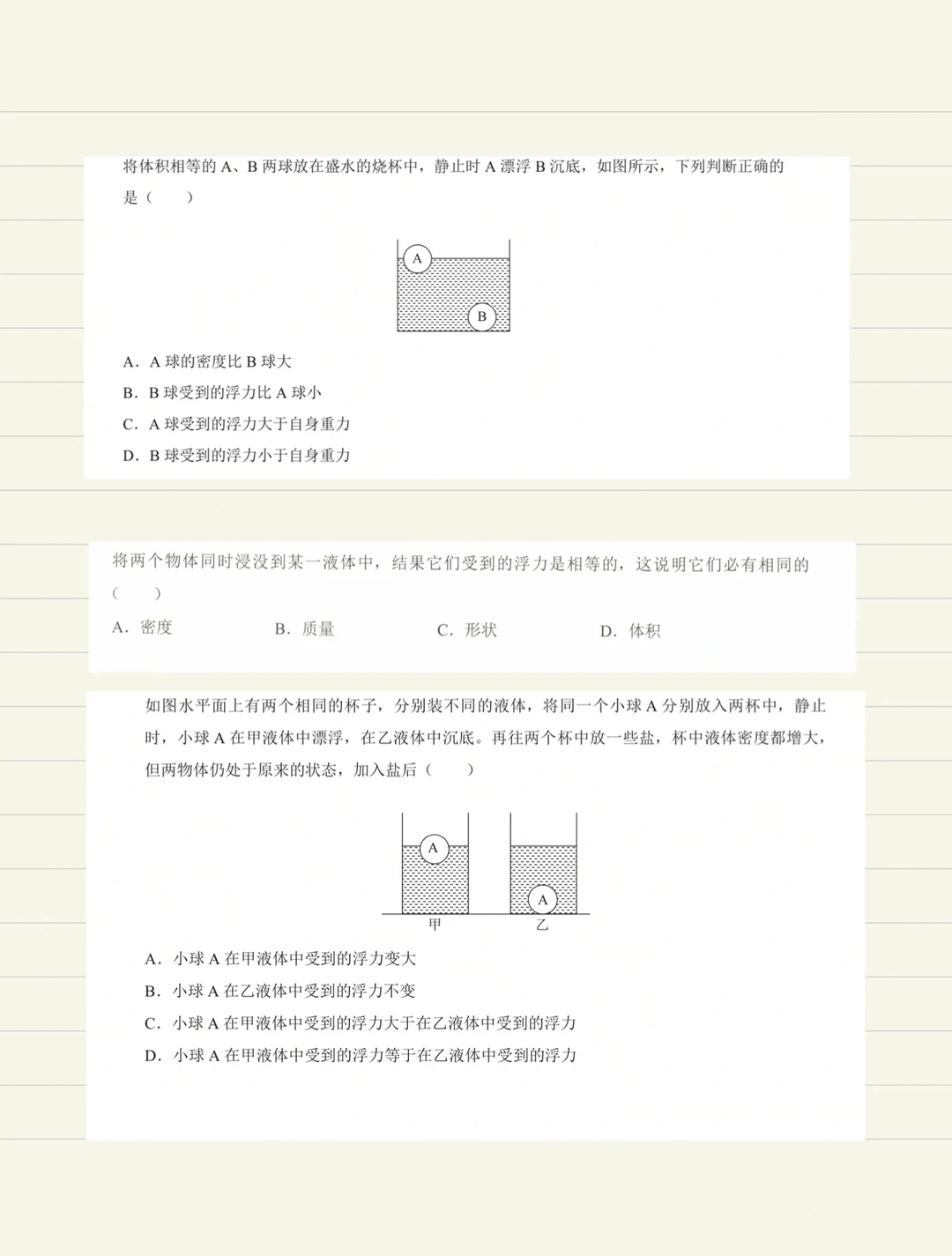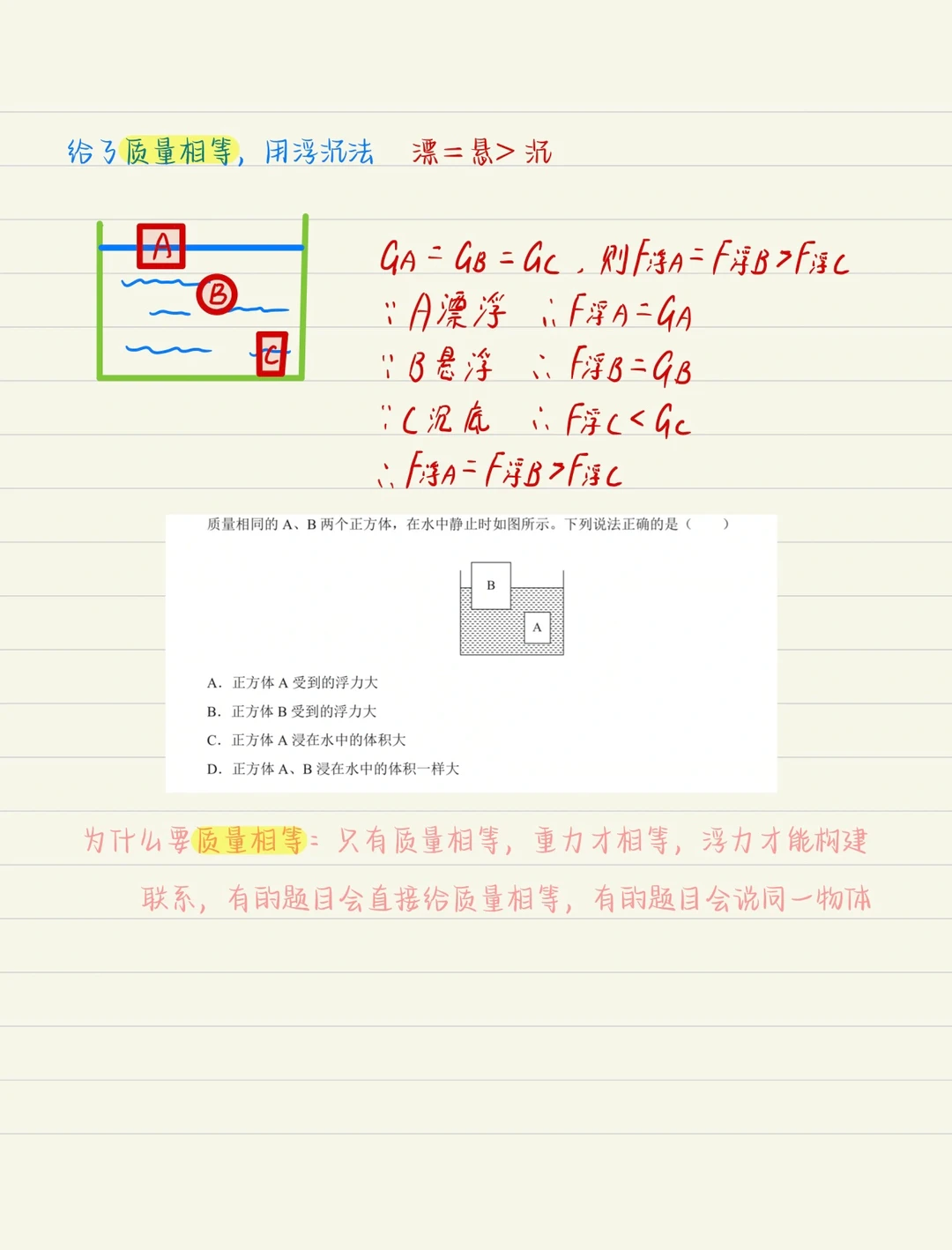 公式法判断浮力,必须体积相同。同液看v排,体积一样,我们才能比较v排和v物关系,同排看肉液,体积相同才能同排,所以公式法必须同体积。 浮沉法必须质量一样,才可以漂等于悬大于沉。