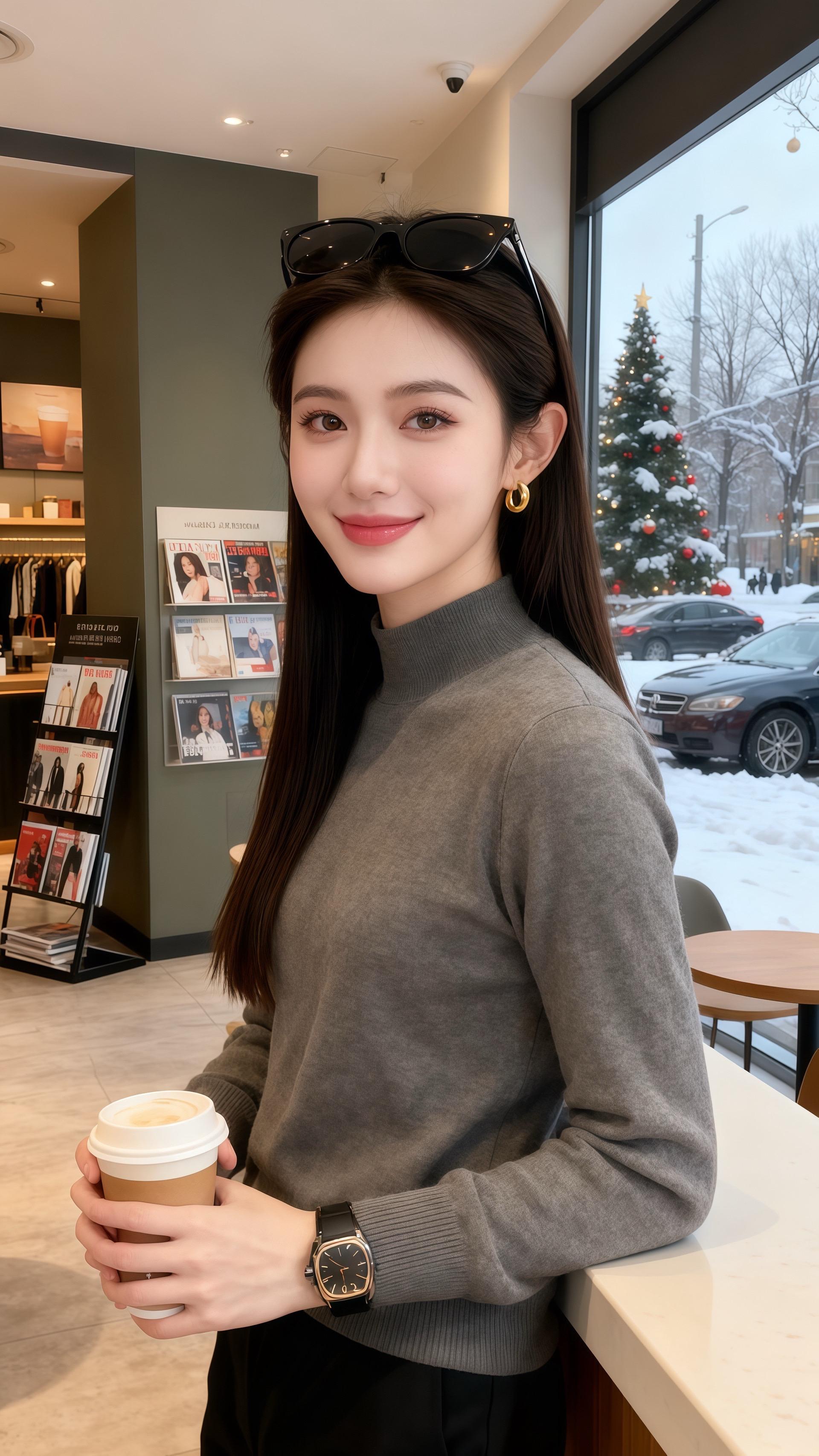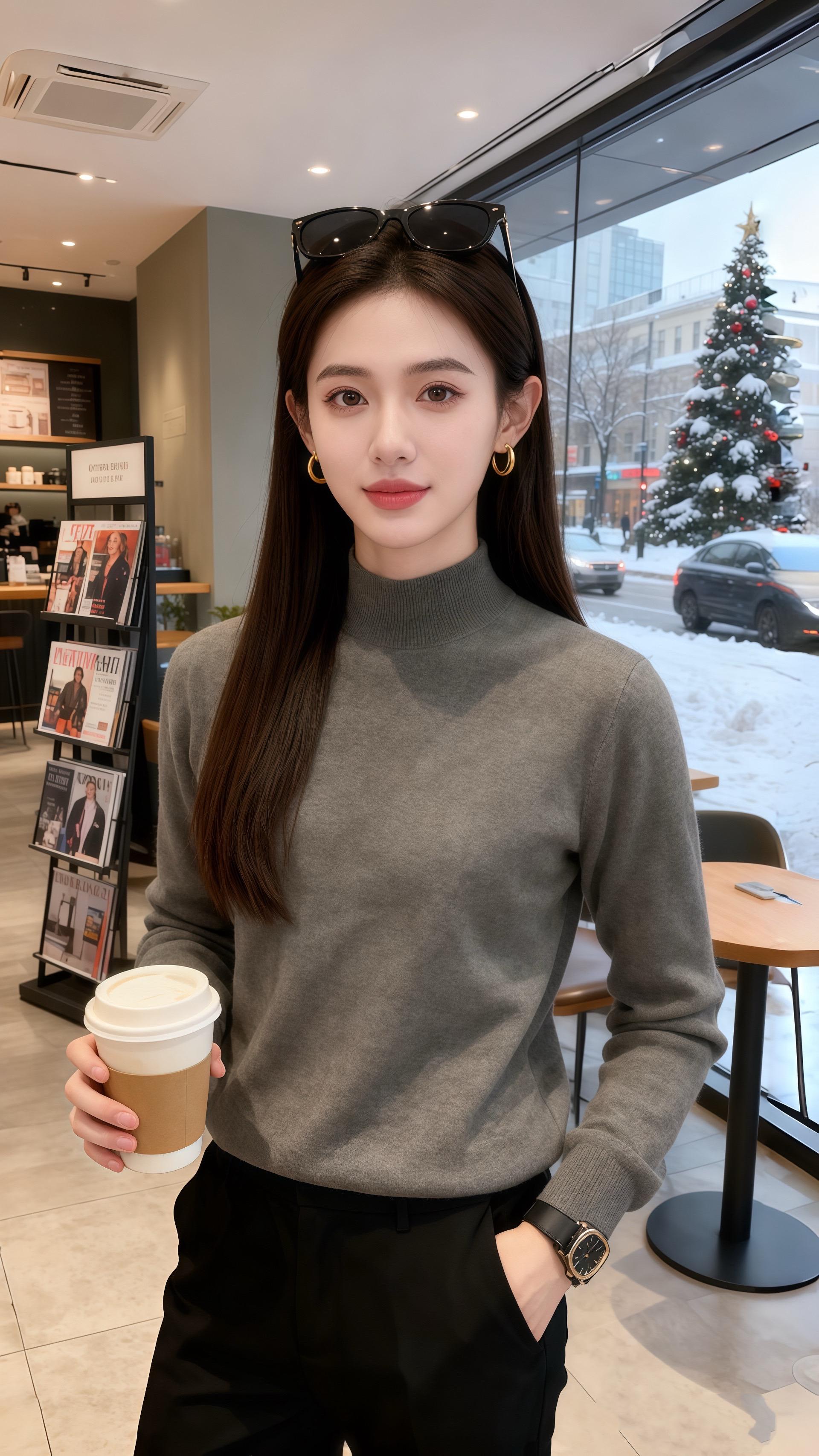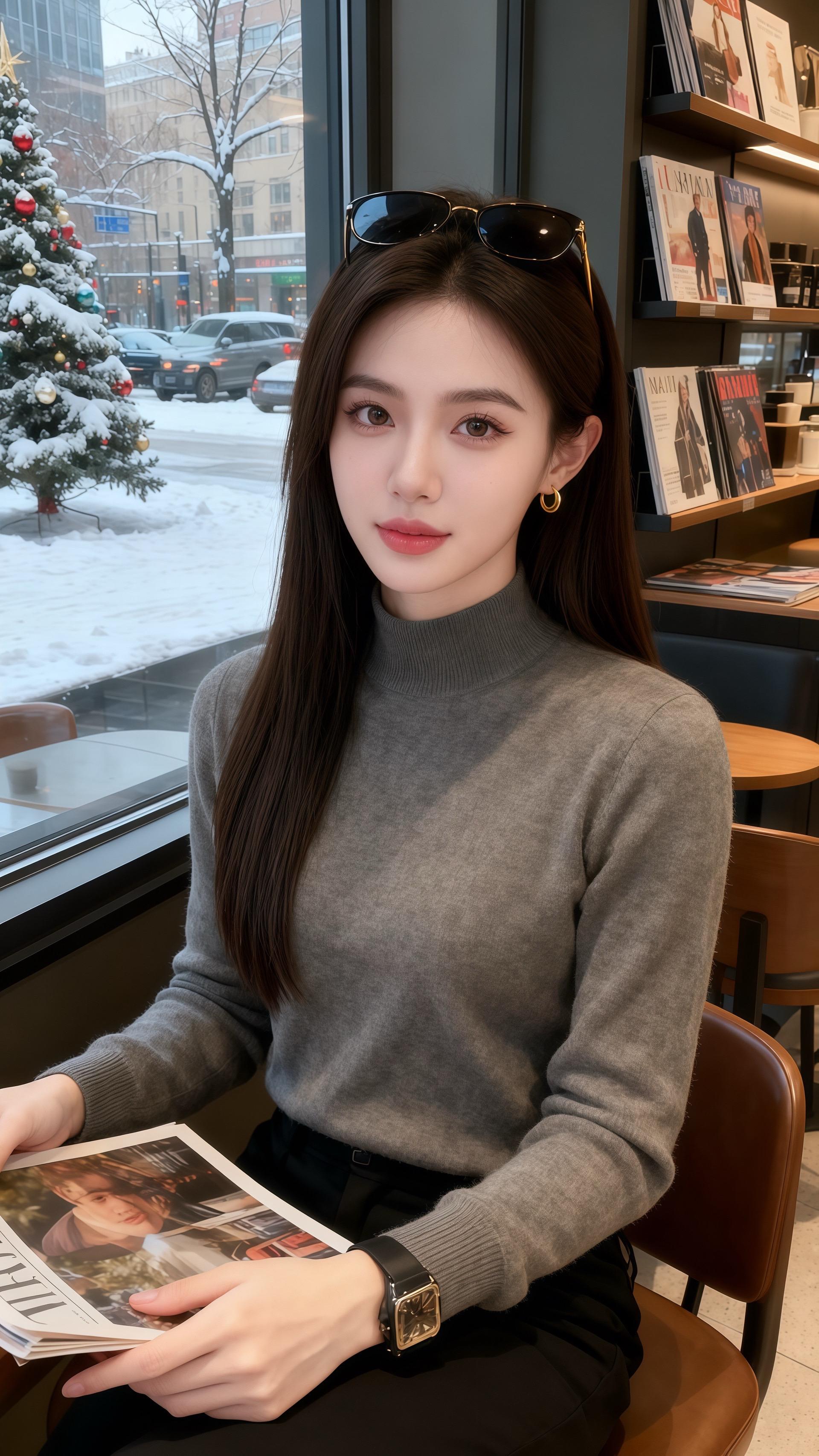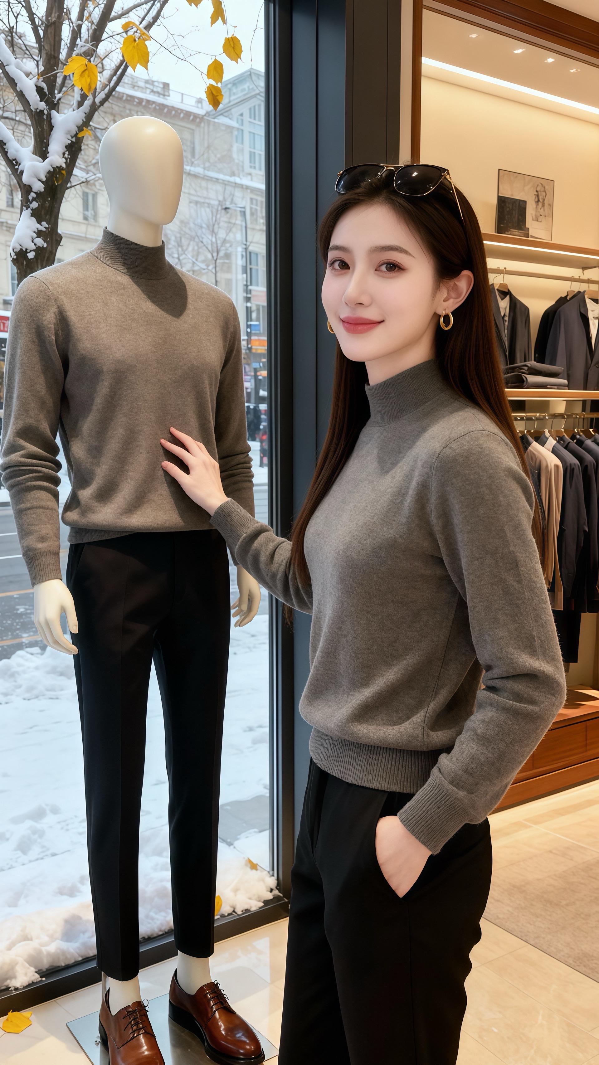 初雪裹着圣诞灯串落满街时,陈也推开咖啡厅门,目光先撞进林漾的灰调毛衣里——半高领衬得颈线软而利落,针织纹理顺着手臂蜷成暖绒,墨黑裤缝裹着踝,腕间的表链在咖啡杯沿泛着细光。 “这一身……”他拍落肩头碎雪,指尖碰了碰杯壁,“像把冬天的温软和清冽都织在一起了。” 林漾翻杂志的手顿了顿,毛衣的绒面蹭得掌心暖:“随便搭的。” 后来他总掐着她买咖啡的点来,看她靠在窗边时,发梢垂在金色耳饰上,窗外的车流与圣诞树都成了衬。某次她踮脚取杂志架顶层的刊,毛衣下摆晃了晃,他忽然说:“第一次见,我觉得这一身比热拿铁更让人想靠